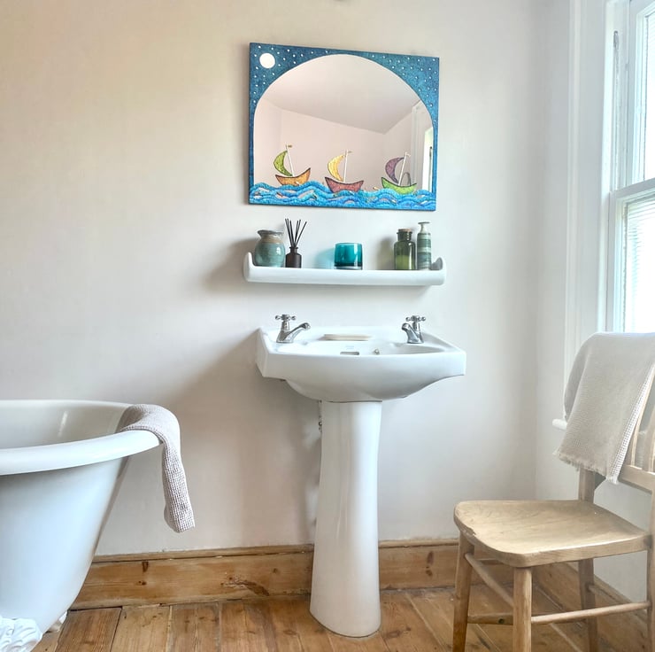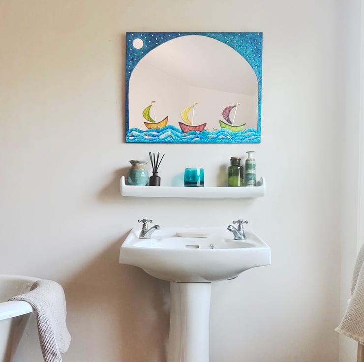 Three sail boats on the waves, amongst leaping fish, beneath a starry sky mirror (61cm x 49cm x 1.2cm). I have always loved working with paper mache and am inspired by land, sea and cityscapes. Each of our mirrors are individually made with love and care in unique designs. The paper mache has a gently textured surface, is painted with acrylic paint and then protected with a matt varnish making it suitable for all rooms in the home. Your mirror will arrive beautifully wrapped and ready to hang.