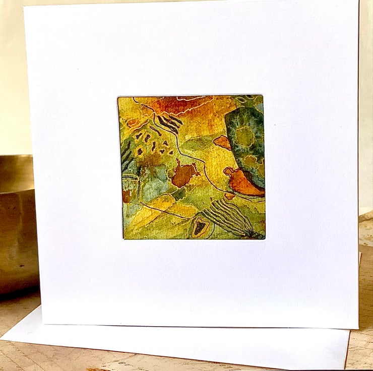Hand painted abstract design on watercolour paper, cold press, acid free, 300 gsm. Mounted in square tri-fold aperture card 300gsm (13.5 x 13.5 cm). Blank inside for your own personal message. Comes with white envelope.