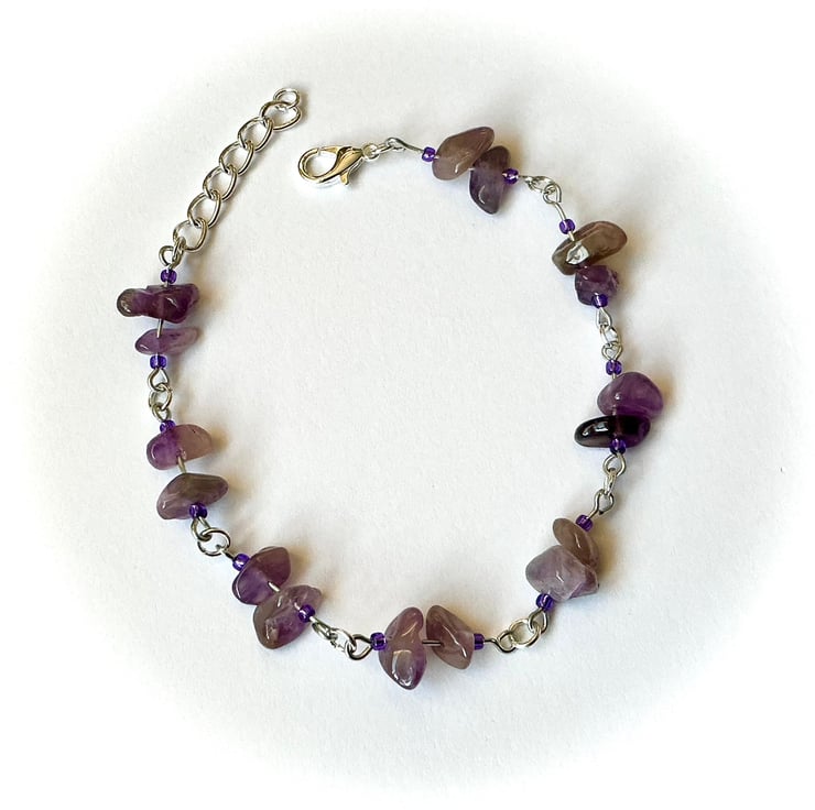 Bracelet with Amethyst gemstone chips. Made in my wire link style with silver plated chain and lobster clasp fastener.