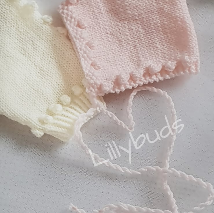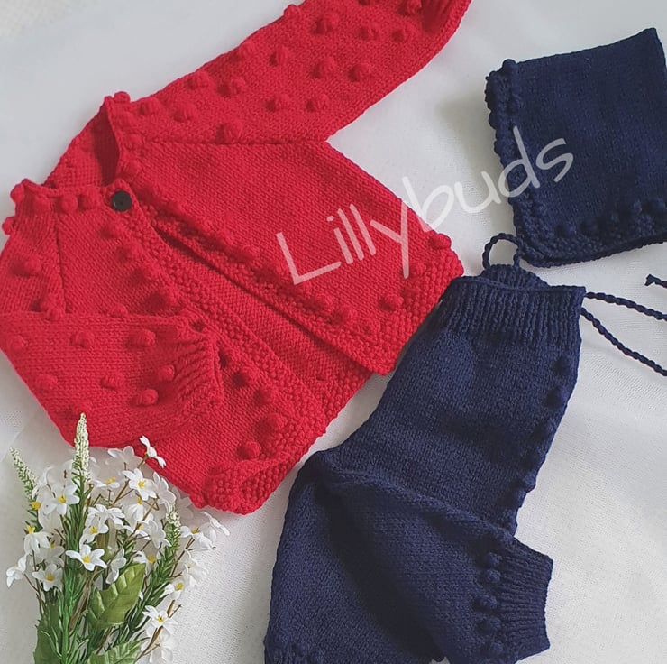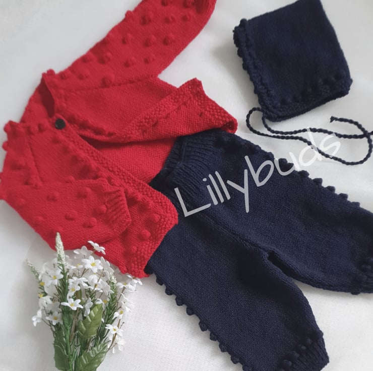 It consists of a cardigan, elastic waist trousers and bonnet, all with cute bobble trims.