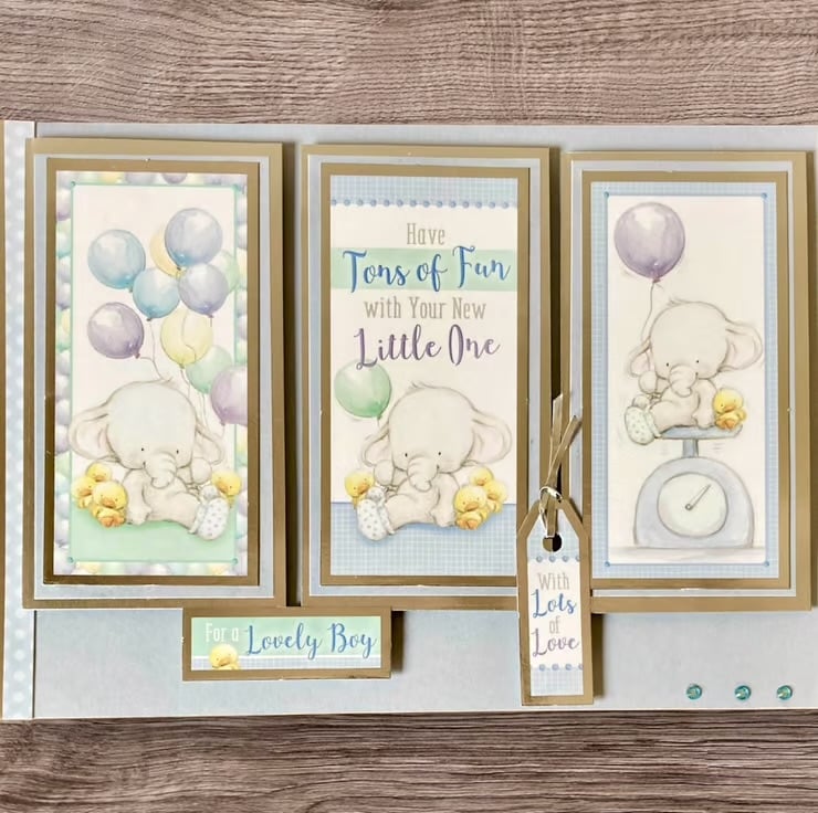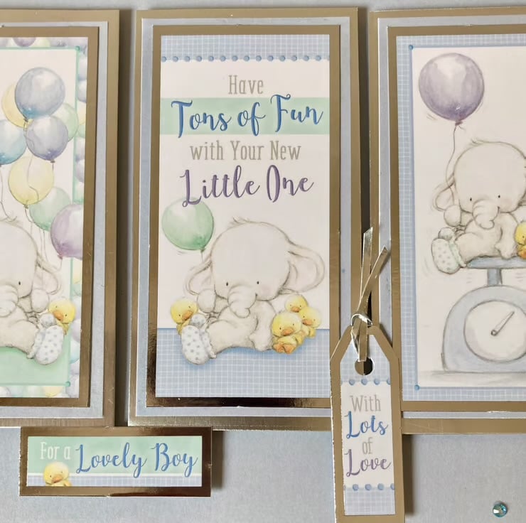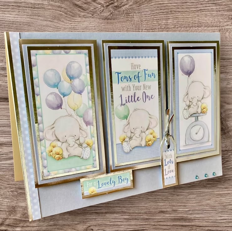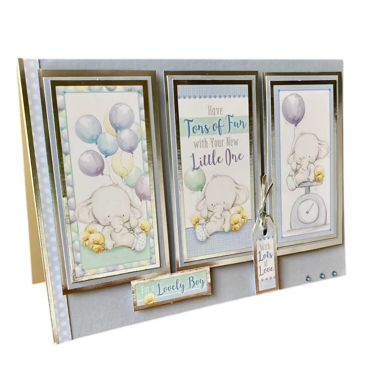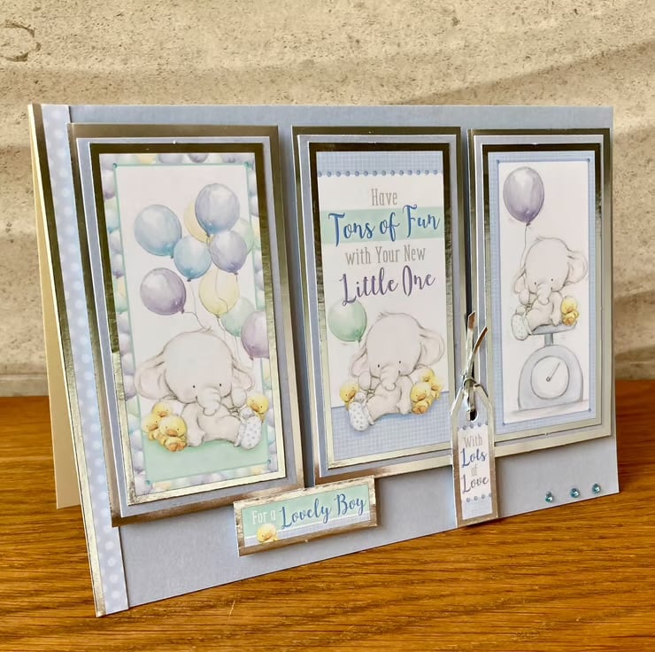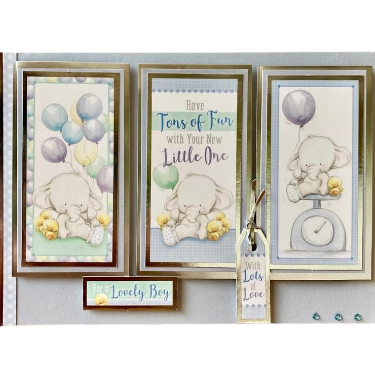 The cream base card has been layered with a pale blue paper. Three toppers that are layered with silver mirror card have been added, these feature cute little elephants and the sentiment Have Tons of Fun with your Little One. Two additional toppers with the words for a lovely boy with lots of love finish the card.