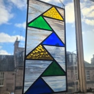 This stunning piece is inspired by the window from tv show "wednesday". The simplified design (to avoid copyright issues) measures 29cm approximately around. Half of the piece uses clear textured and slightly wispy glass whilst the other half is full of colour! Hand crafted using the Tiffany method it is delicate to look at but made to last and will enchant you, or an addams family fan, for years to come