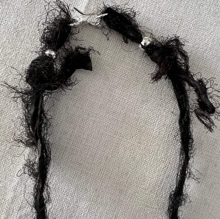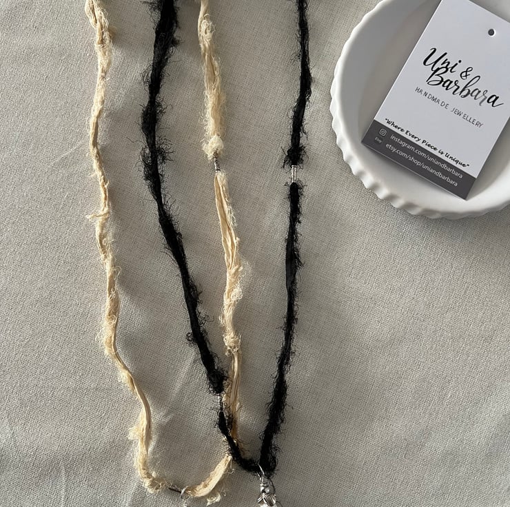 The black sari silk necklace is approximately 33cm in length, while the beige sari silk necklace is around 35cm. Both necklaces hang to around the chest area when worn. Please refer to the photos for more details.