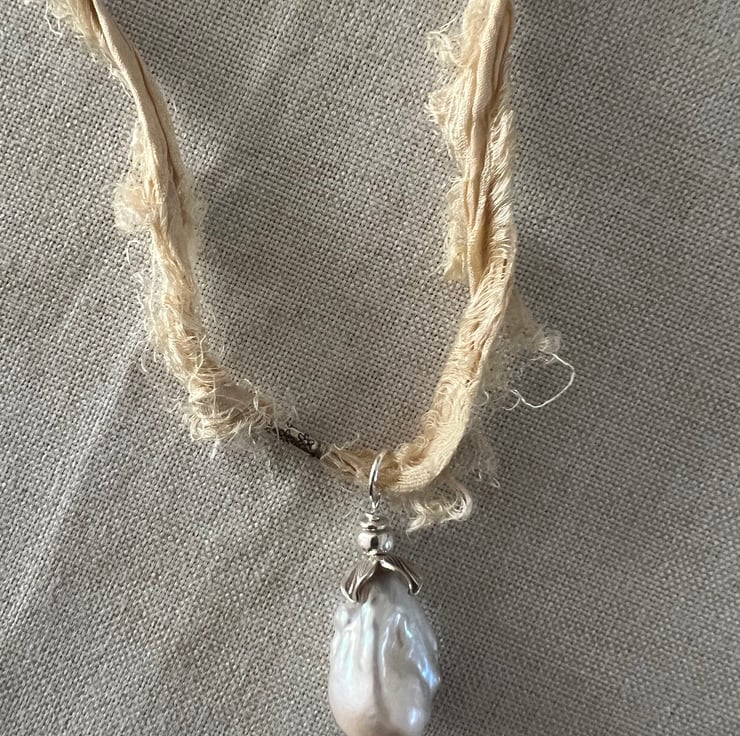 This necklace is a beautifully crafted vintage-style piece, featuring an elegant baroque pearl and sari silk.