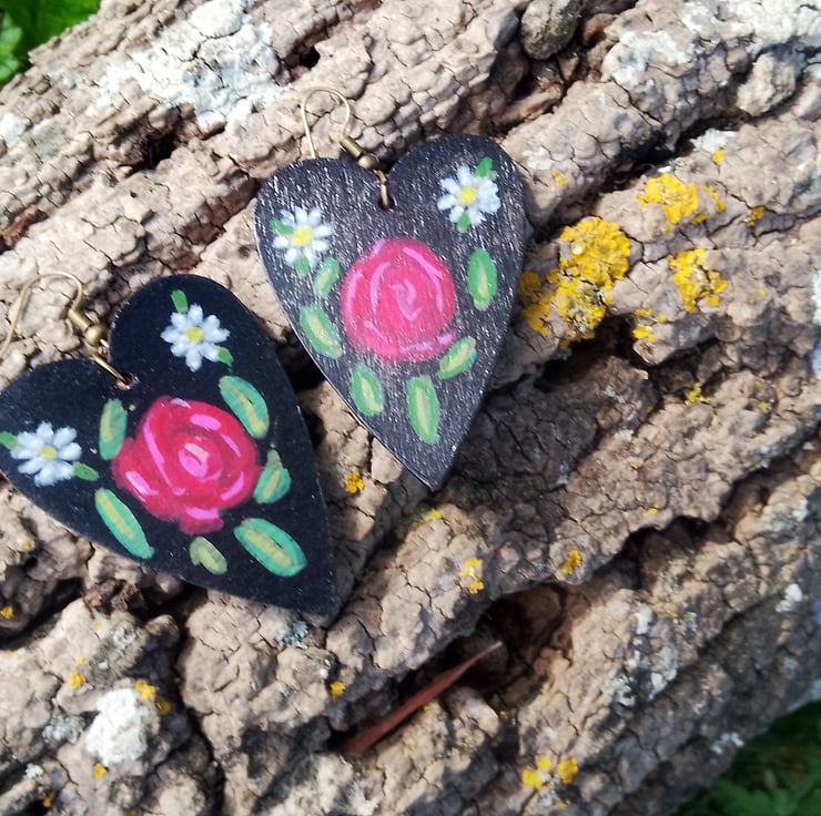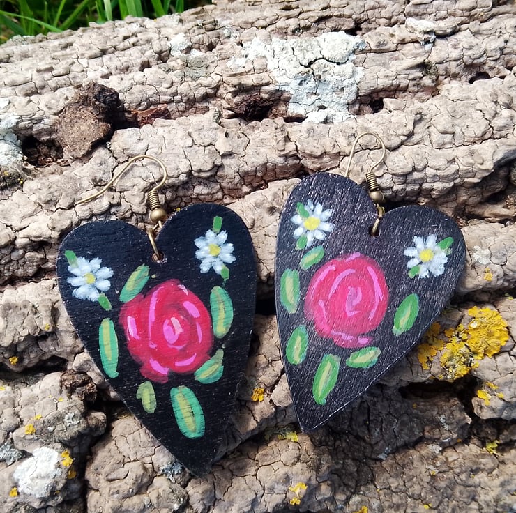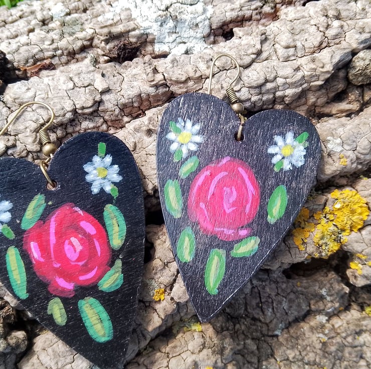 A one of a kind pair of lightweight hand painted wooden earrings inspired by the traditional canal/barge art of the British inland waterways.
