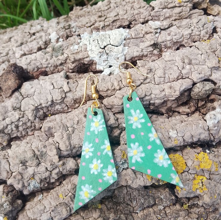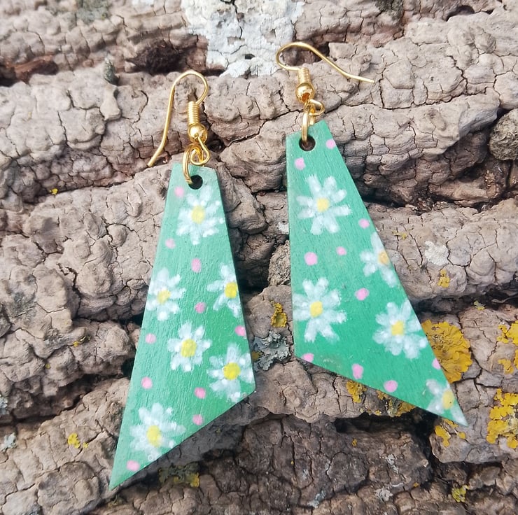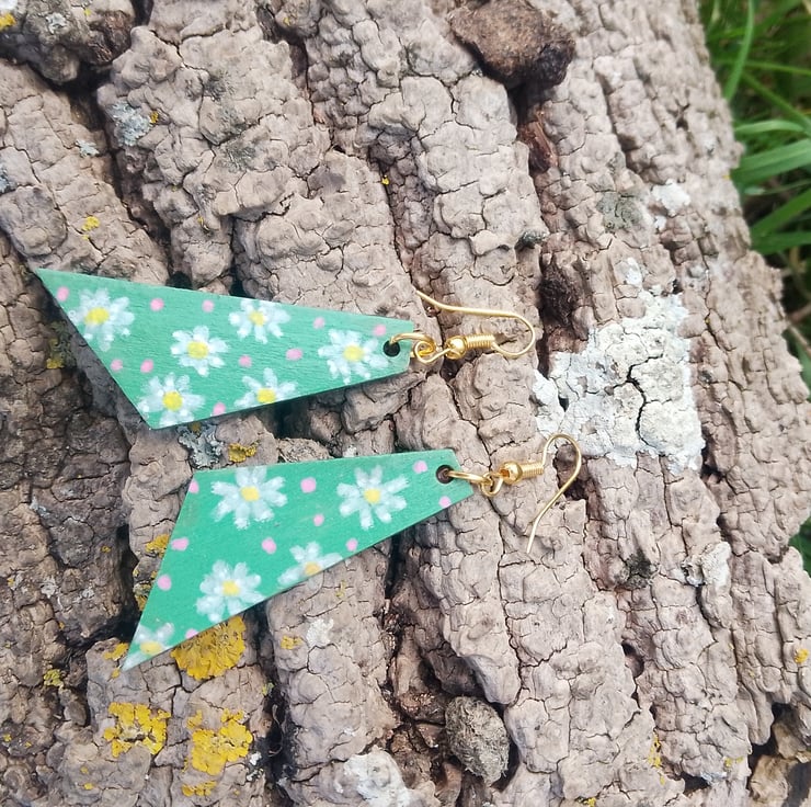 A beautiful one of a kind pair of vibrant, light weight, wooden, hand painted earrings inspired by the traditional folk art of the British inland waterways.