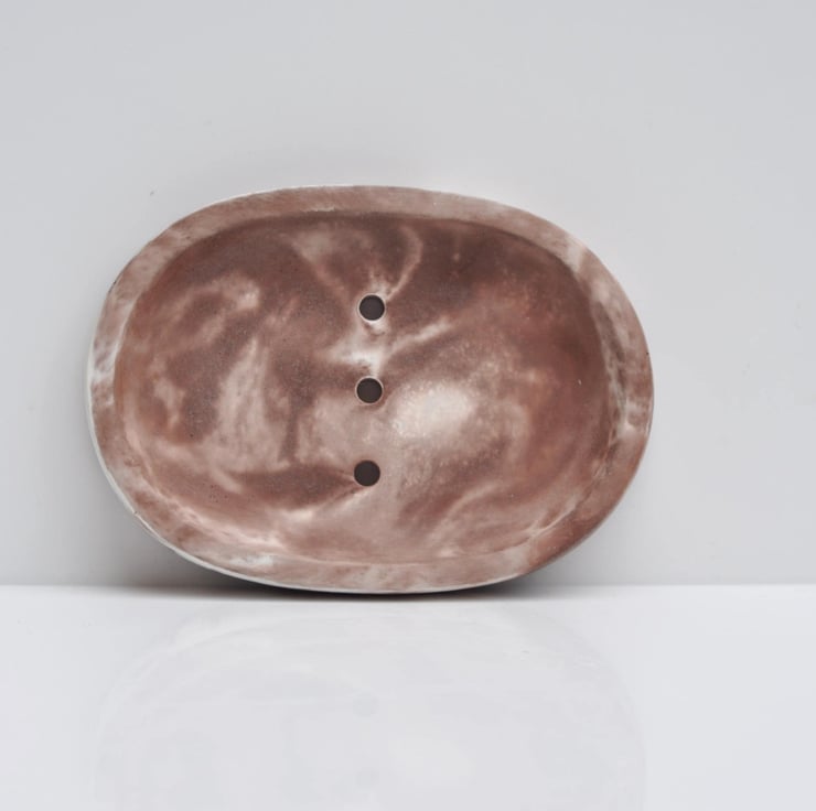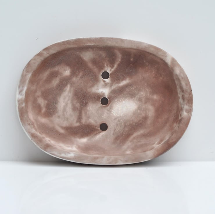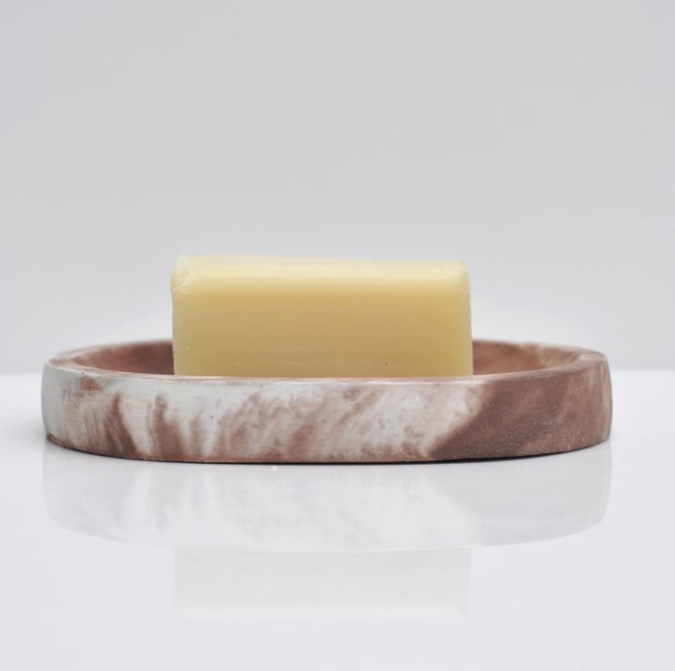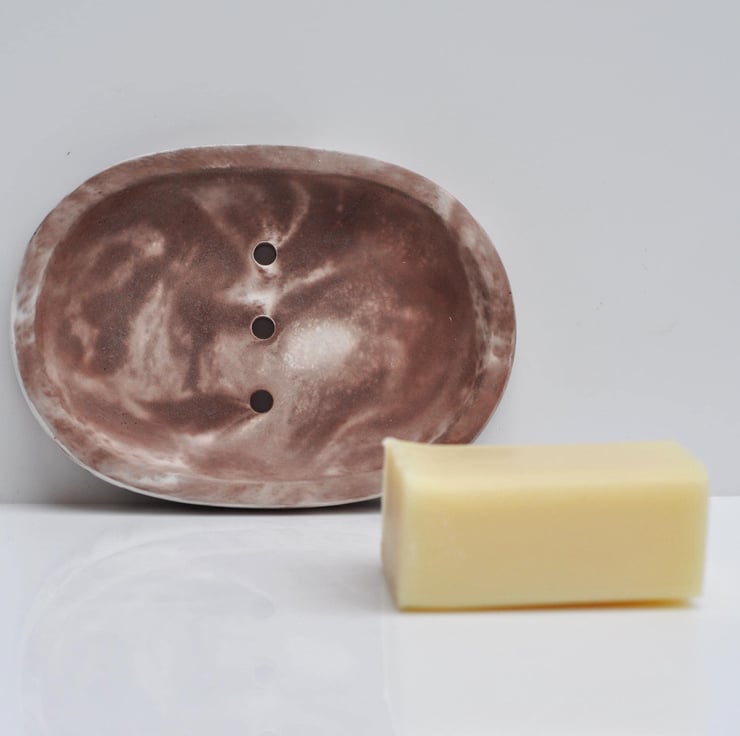 Hand-poured concrete soap dish with a sleek, minimalist design, perfect for your bathroom or kitchen. The modern brown and white colour palette complements any decor while keeping your soap dry and tidy.