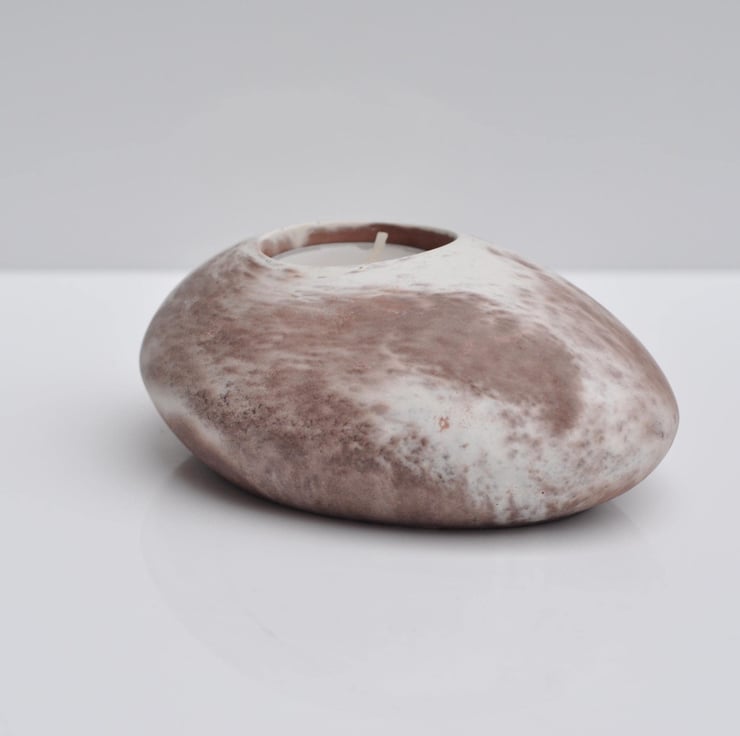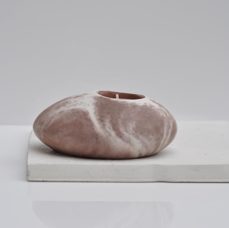 Hand-poured concrete tea candle holder with a beautiful white and brown finish, perfect for adding a minimalist, modern touch to your home. This functional candle holder is ideal for creating a cozy atmosphere on your mantelpiece, bedside table, or dining area. It holds a standard tea light, making it perfect for relaxation, meditation, or setting the mood in any room.