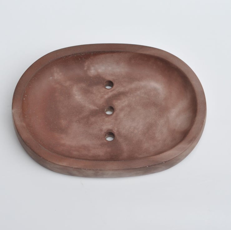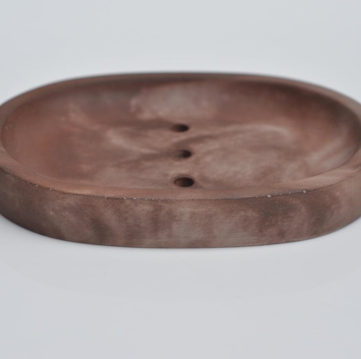 Hand-poured concrete soap dish with a stylish brown and white finish, designed to keep your soap dry and extend its lifespan. The minimalist and functional design makes it a great addition to your bathroom or kitchen, perfect for holding soap, sponges, or even small accessories.