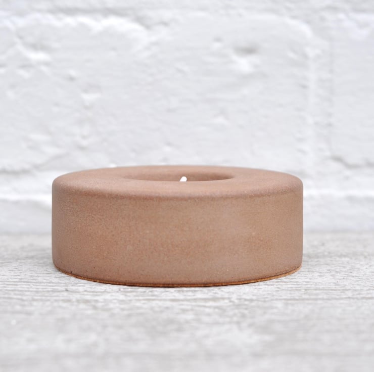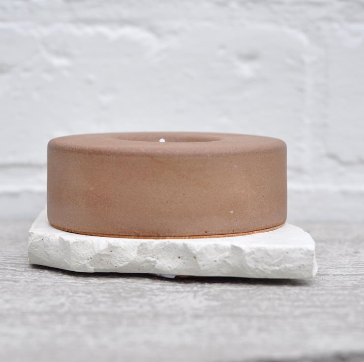 This terracotta-colored brutalist-style tea candle holder is sculpted from hand-poured concrete. Its minimalist design complements any modern or industrial decor, adding a stylish touch to your space while holding your tea candles securely.