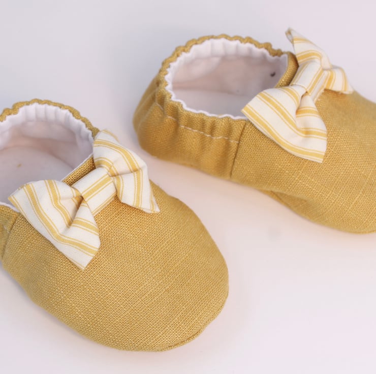 Mustard linen baby girls shoes, with bow, baby shoes, crib shoes, pram shoes.