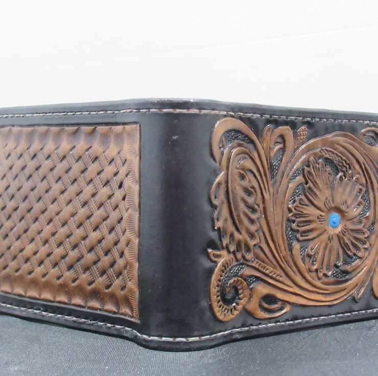 Each wallet is crafted entirely by hand from start to finish and represents around 10 hours of work. This wallet is made from premium leather: 4-5 oz. outside, and 2-3 oz. interior . Next, the artwork is carefully cut and hand-tooled into the leather, producing a raised, three dimensional design before the dyes and finishes are carefully applied to the tooling and preserve your wallet for many years. Lastly, the billfold is assembled by saddle stitching it together by hand.