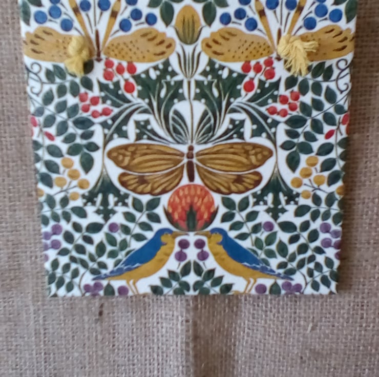 This Ceramic Wall tile was Hand Decoupaged using this William Morrris Design and comes Ready to Hang from yellow Macrame cord and finished with a cork backing . My Tiles have been painted with 2 coats of specialist paint and a Polyvine glaze finish to protect the image. the tile is 15cm sq Unique Gift for any occasion/Home Decor.