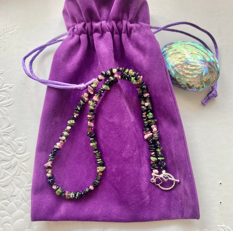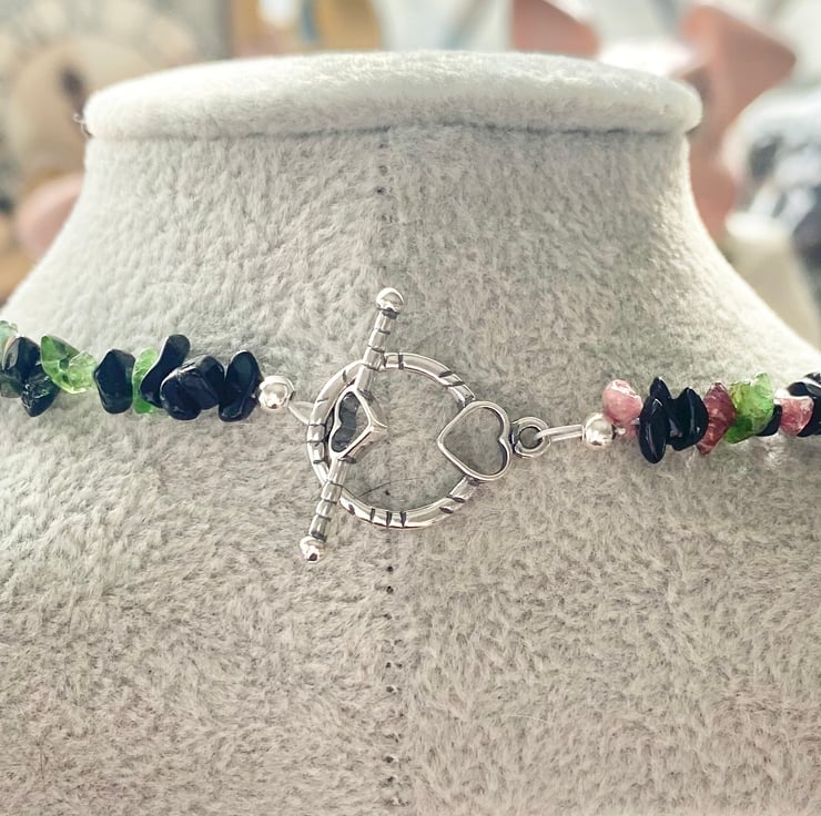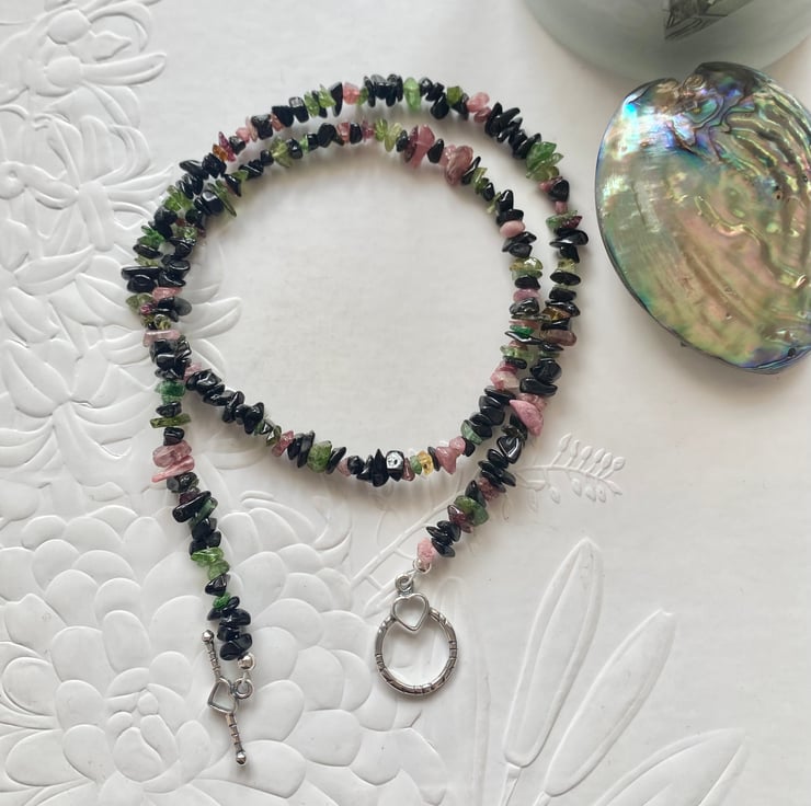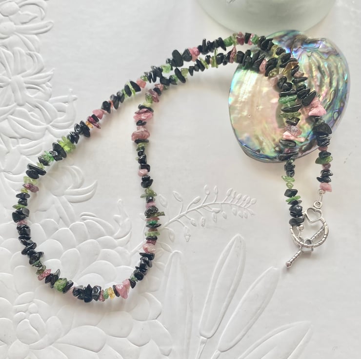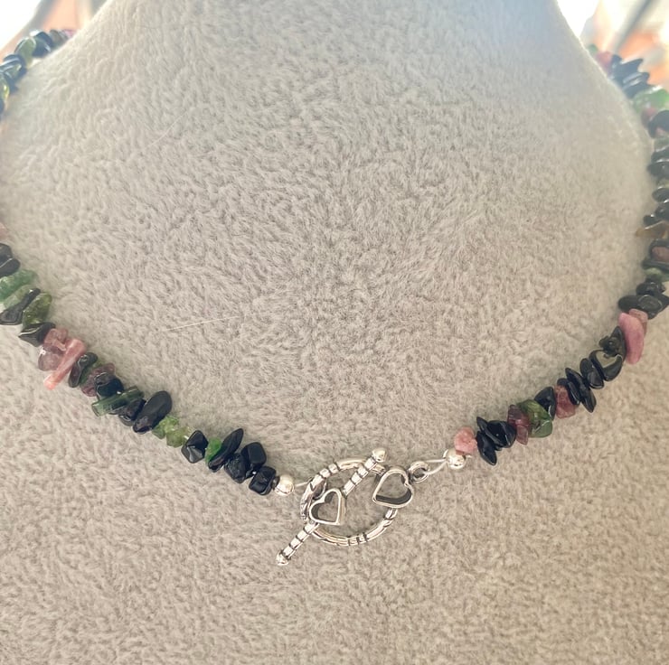 An absolutely stunning handmade necklace featuring multi colour Tourmaline nuggets. I have finished the necklace with an etched 925 sterling silver toggle clasp, with a lovely heart detail, making it extremely easy to fasten.