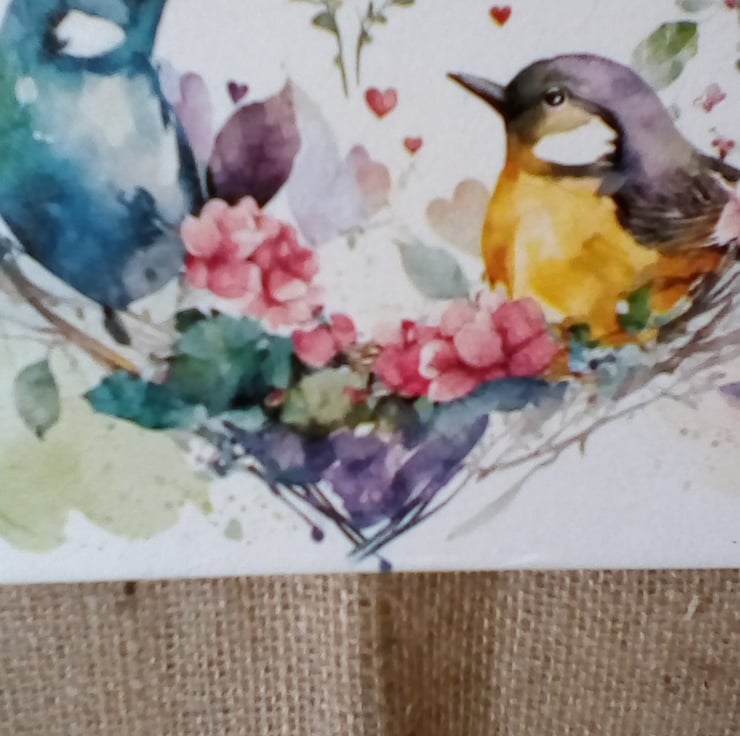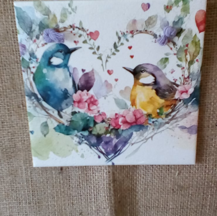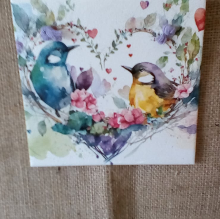 This Unique Ceramic wall tile is 15cm sq and has been Hand finished with this lovely wild life birds image in a Heart frame comes ready to hang with a lilac Macrame cord and fished with a cork back and top coats of Polyvine Glaze to Protect the image would suit any occasion/home decor. Please visit my New Store for unique Decoupage gifts Made with lovex