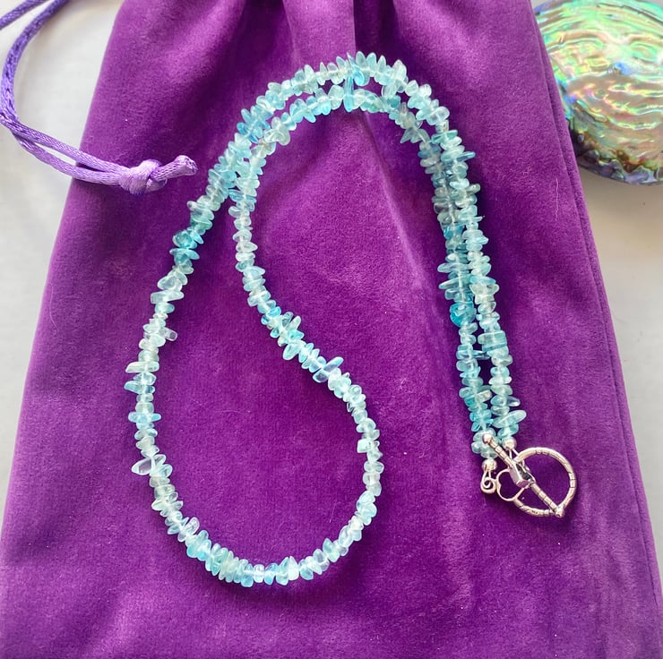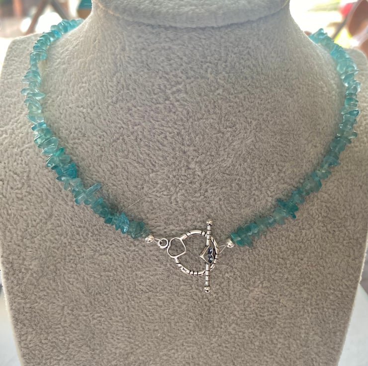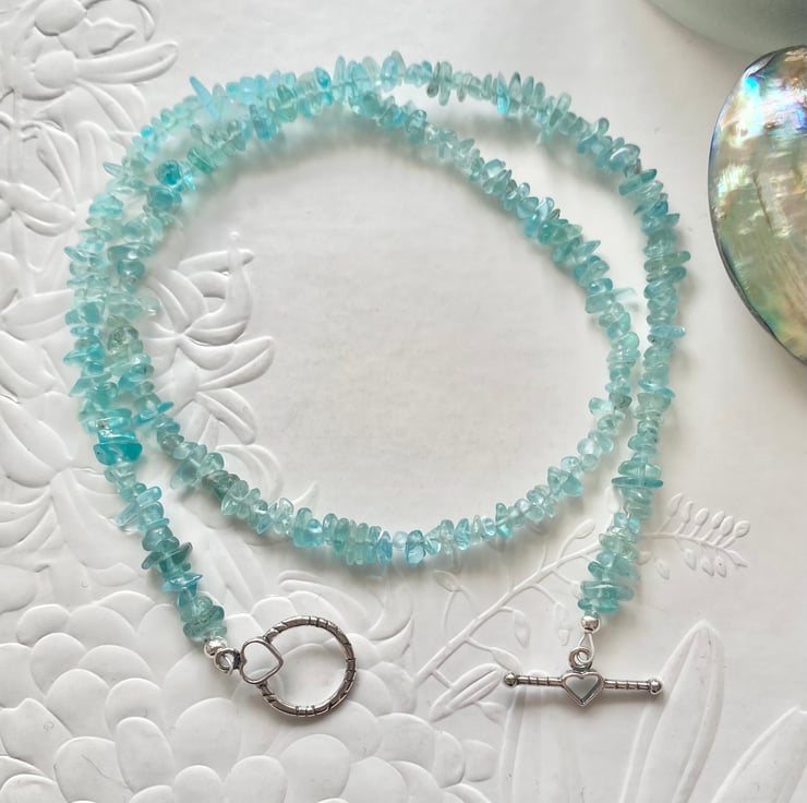 An absolutely stunning handmade necklace featuring beautiful Apatite nuggets. I have finished the necklace with an etched 925 sterling silver toggle clasp, with a lovely heart detail, making it extremely easy to fasten.