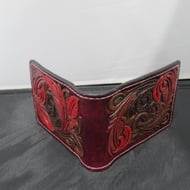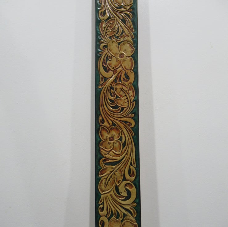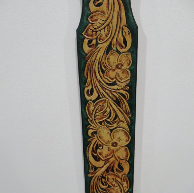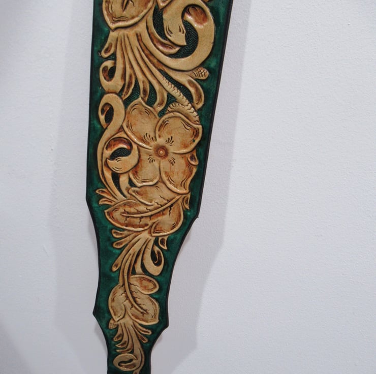 Each instrument strap is crafted entirely by hand from start to finish and represents around 20-30 hours of work. This instrument strap is made from premium leather: 8-9 oz. main body, and 4-5 oz. for the adjustable part . Next, the artwork is carefully cut and hand-tooled into the leather, producing a raised, three dimensional design before the dyes and finishes are carefully applied to the tooling and preserve your wallet for many years.