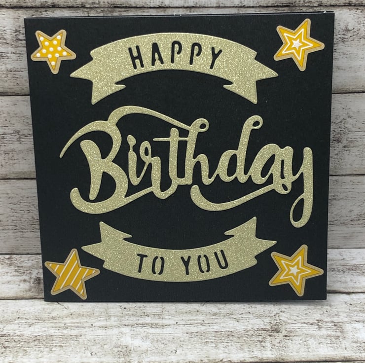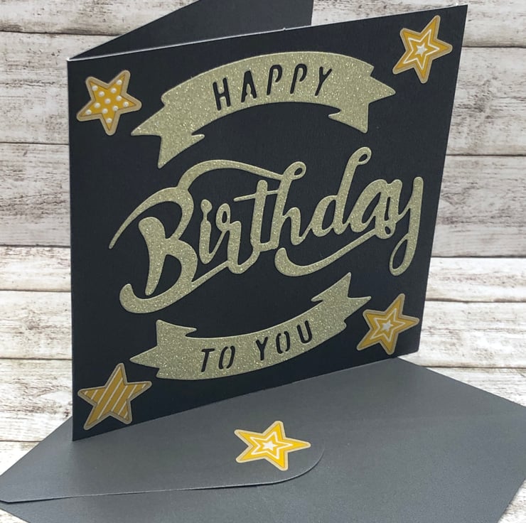 A dark grey square card (13 cm) with a slight sheen to it. A die cut " Happy Birthday to You" in pale gold glittery card stands out against the dark background. Four yellow stars at the corners complete the design. A stylish simple design suitable for male Birthdays, or someone that likes a simple vintage design. Inside is blank for own message. Comes with matching envelope also decorated on the back with a star.