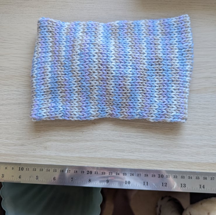 Knitted earwarmers, twisted at the front, faux leather tag