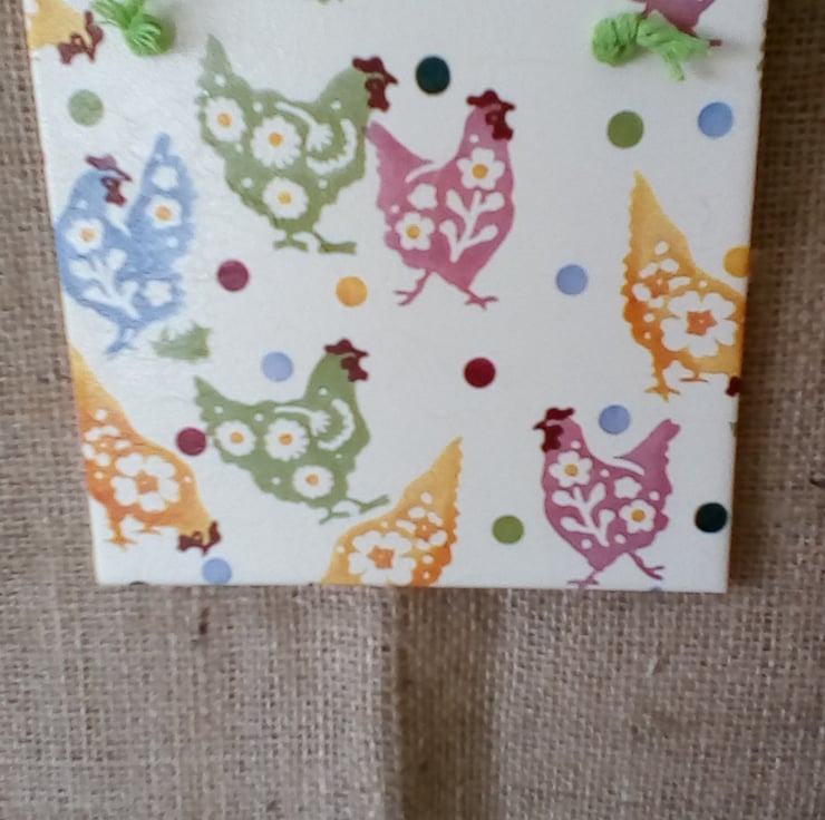 This Decoupaged Tile is the Design of Emma Bridgewater would make a lovely Gift for any occasion/Home Decor /Easter Gift The ceramic tile has been painted with a specialist paint and the image has been coated with a Polyvine Glaze to protect the image the tile is ready to hang from a Apple Green Macrame cord and finished with a cork back as shown Please view my range of Unique Decoupage items each has been made with Lovex