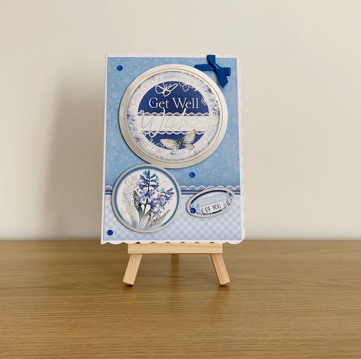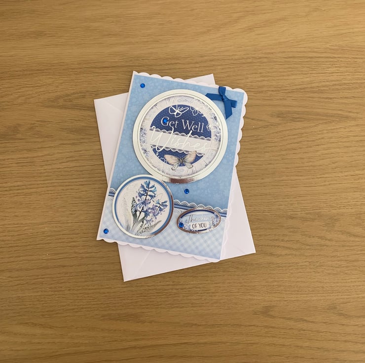 The card is embellished with blue rhinestones & a single blue satin bow.