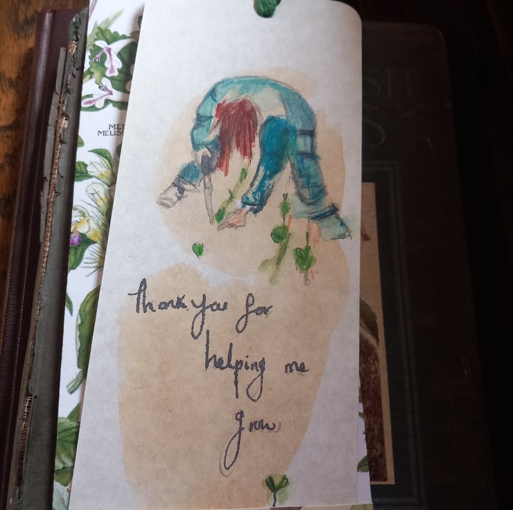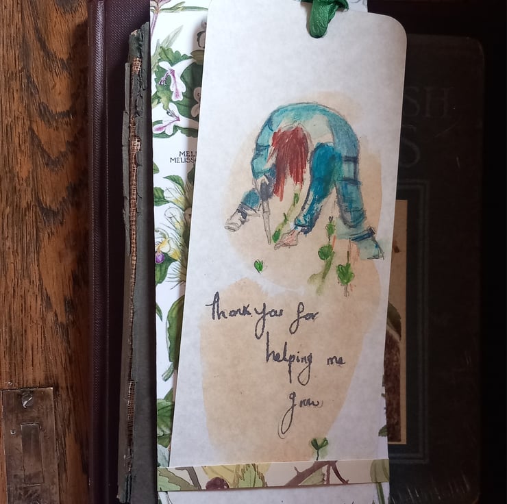 'The garden Fairy' This is a mini works of art, a gift for a garden and book lover. I hand drawn all my book marks with an antique dip pen. Each has a silk trim added to it. They are signed and come in a handmade envelope then in a brown card envelope to post, no plastic in my packaging. Free UK postage