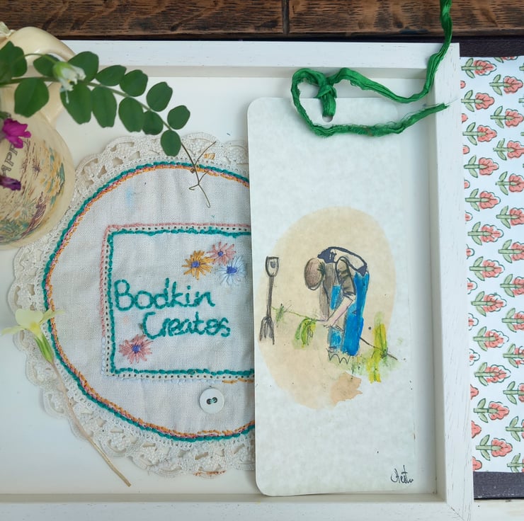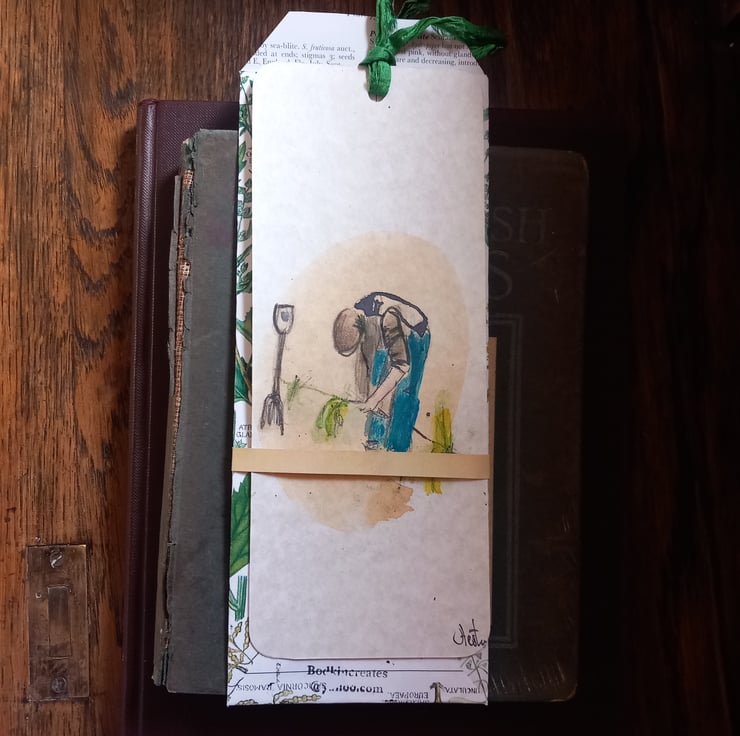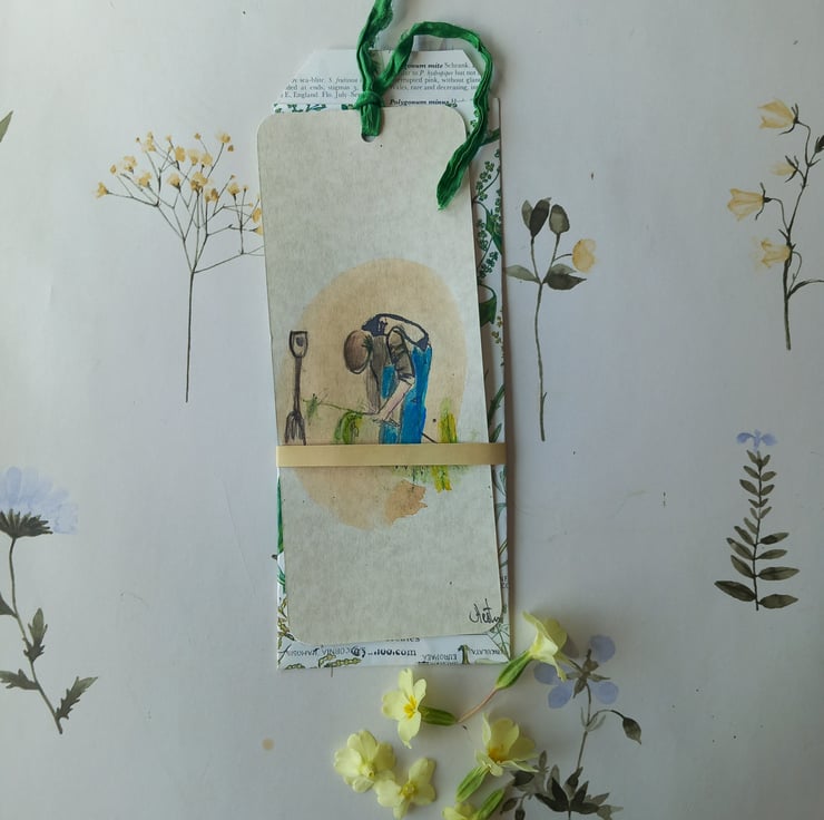 'The gardener' This is a mini works of art, a gift for a garden and book lover. I hand drawn all my book marks with an antique dip pen. Each has a silk trim added to it. They are signed and come in a handmade envelope then in a brown card envelope to post, no plastic in my packaging. Free UK postage