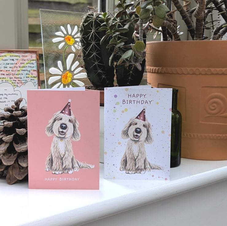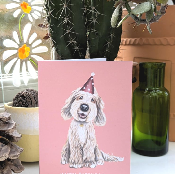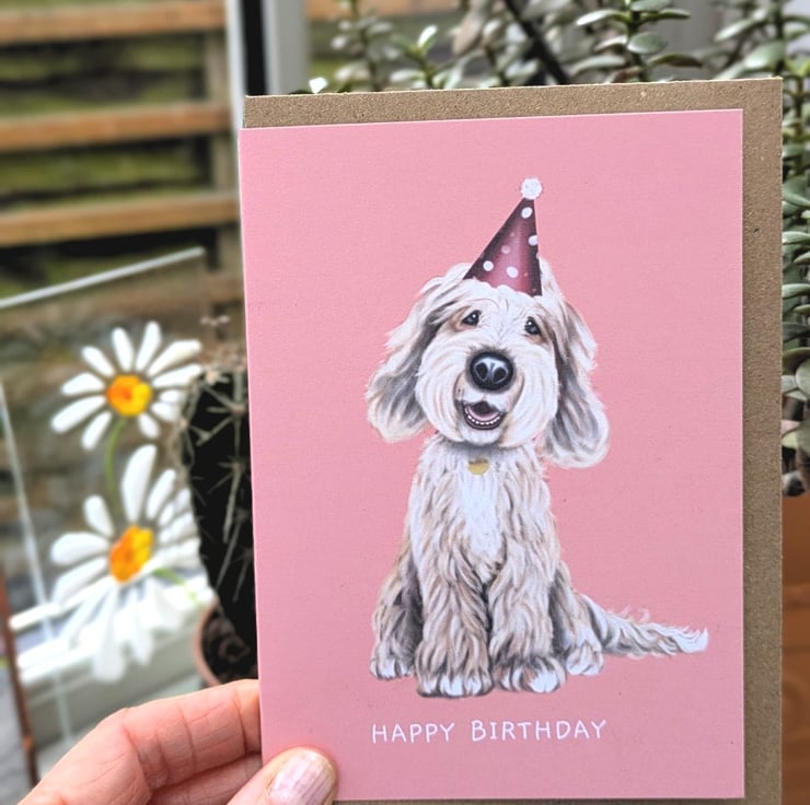 'Happy Birthday' cream Labradoodle on pastel pink background - Eco Friendly Card.