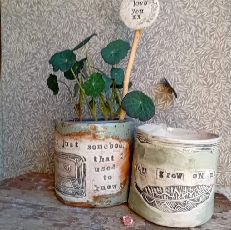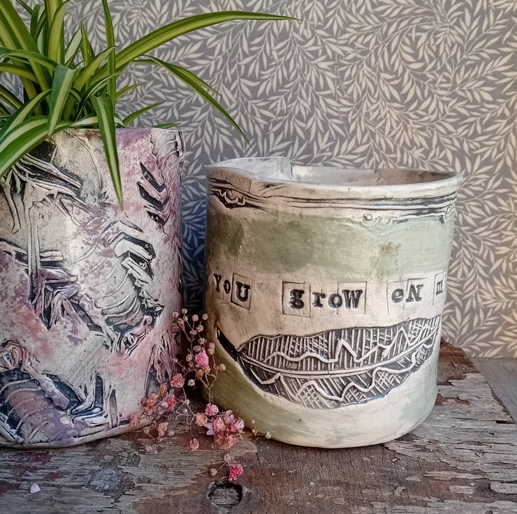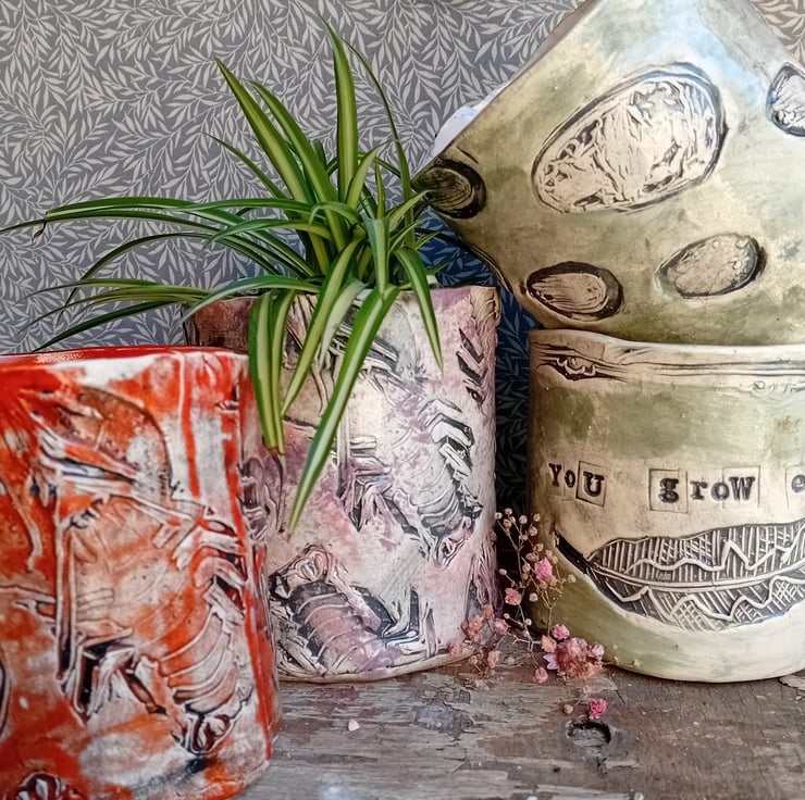 Handmade in earthenware clay, and imprinted with one of my linocut designs, shades vary