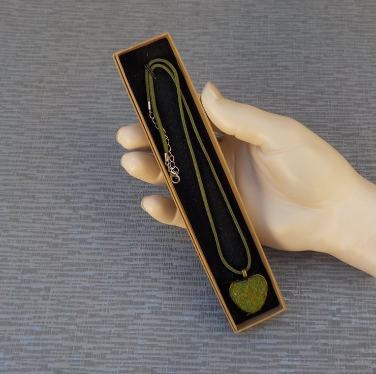 Here's an unusual pendant necklace; it is handmade from a plain moss green design of Harris tweed fabric. I have shaped and mounted the Harris tweed onto a heart-shaped "antique bronze" coloured metal pendant, 2.5cm across. Then I have strung it onto a co-ordinating moss green faux suede cord made with wool. The cord is 45cm (18") long, with a 5cm (2") extension chain.