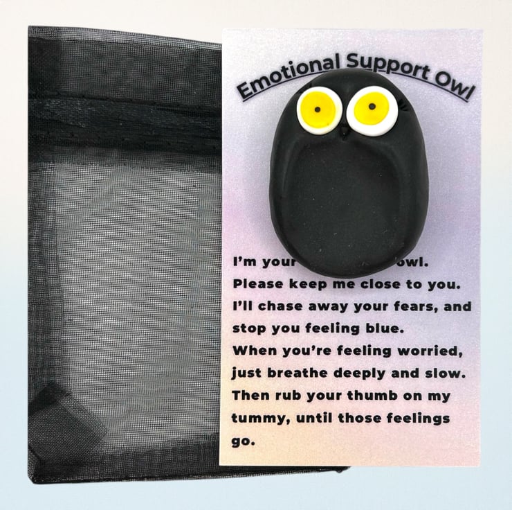 This adorable little black owl is handcrafted from polymer clay using my unique design. It makes a lovely, thoughtful gift for anyone who could use a little comfort or as a self-care gift for yourself. It features a smooth indent on its tummy, allowing it to fit comfortably in your hand with your thumb resting in the indent. This owl can be a grounding tool when you’re anxious or overwhelmed. Focusing on the sensation of your thumb on its smooth tummy and taking deep breaths can help comfort you and bring you back to the present moment.