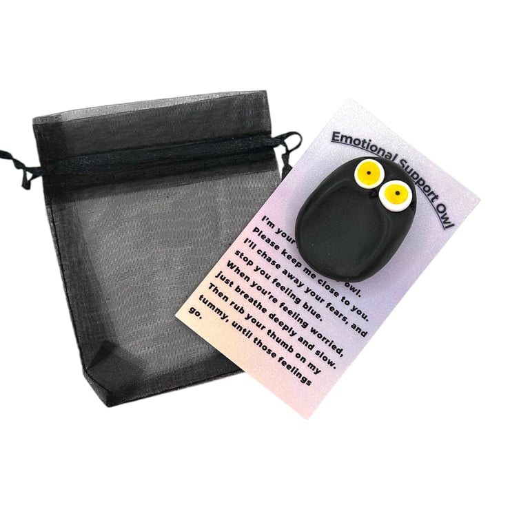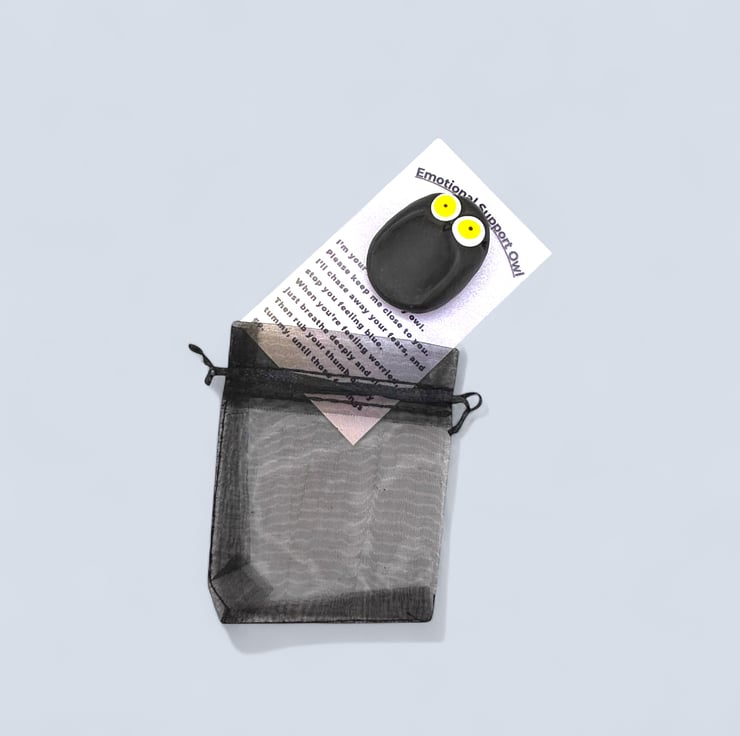 The owl comes attached to a card that includes a poem I wrote about its purpose. You can easily detach the owl from the card for convenience, making it easier to fit into your pocket or handbag. I’ve also included a small organza bag in a complementary colour for safely storing your owl buddy. Since each owl is handcrafted, no two will ever be alike, but they will all be undeniably cute.