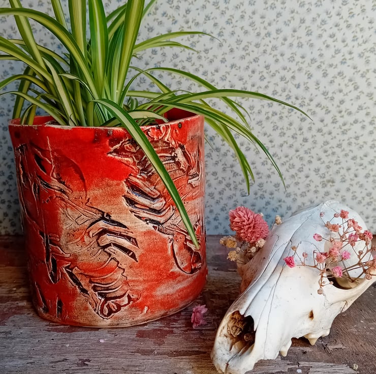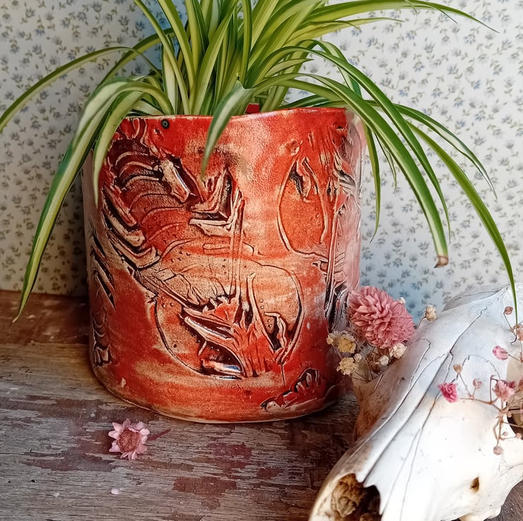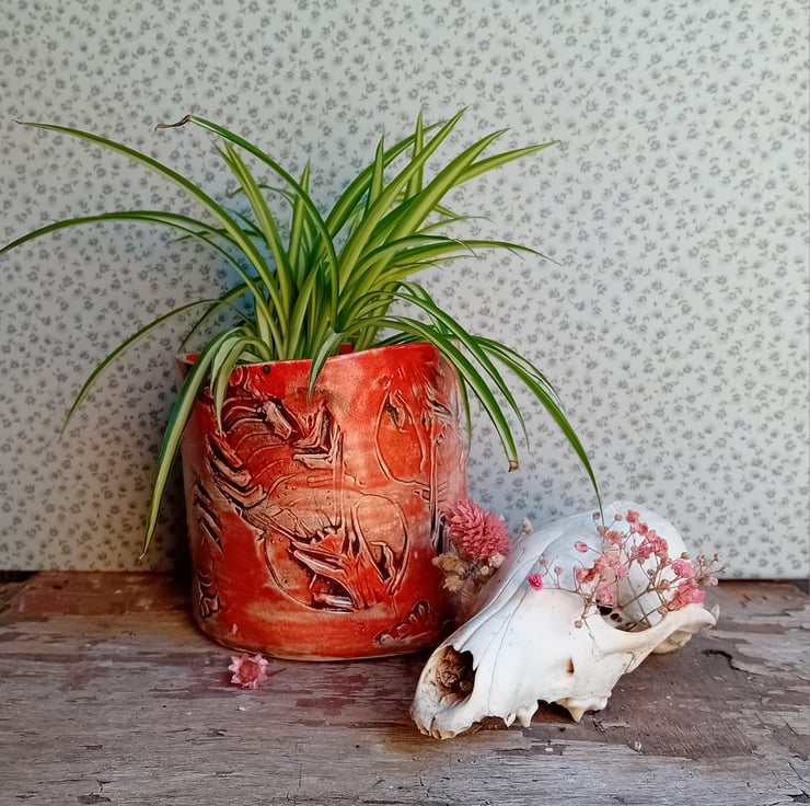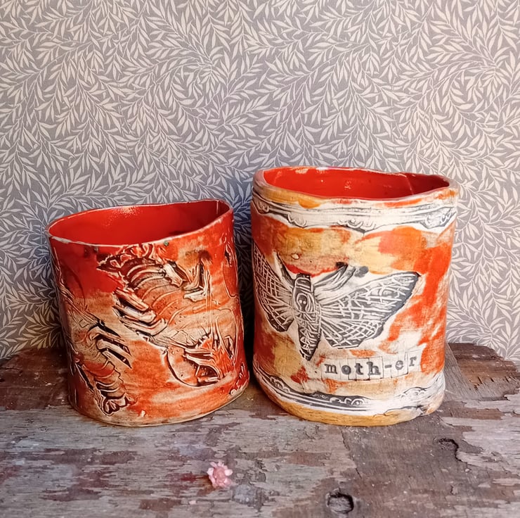 Handmade in earthenware clay, and imprinted with one of my linocut designs, shades vary