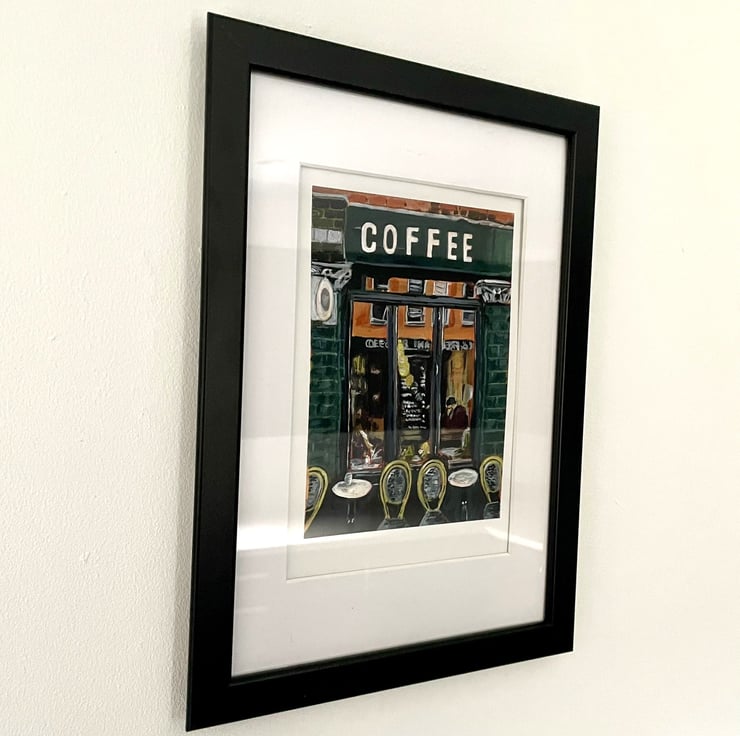 This high quality print is a reproduction of my original acrylic painting of Just between Friends coffee shop located in Manchester's (England) Northern Quarter.