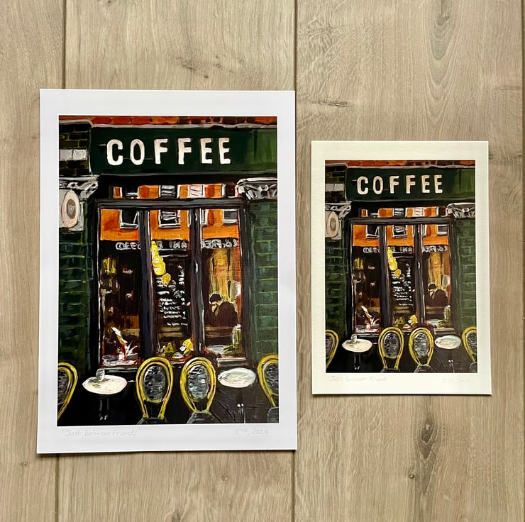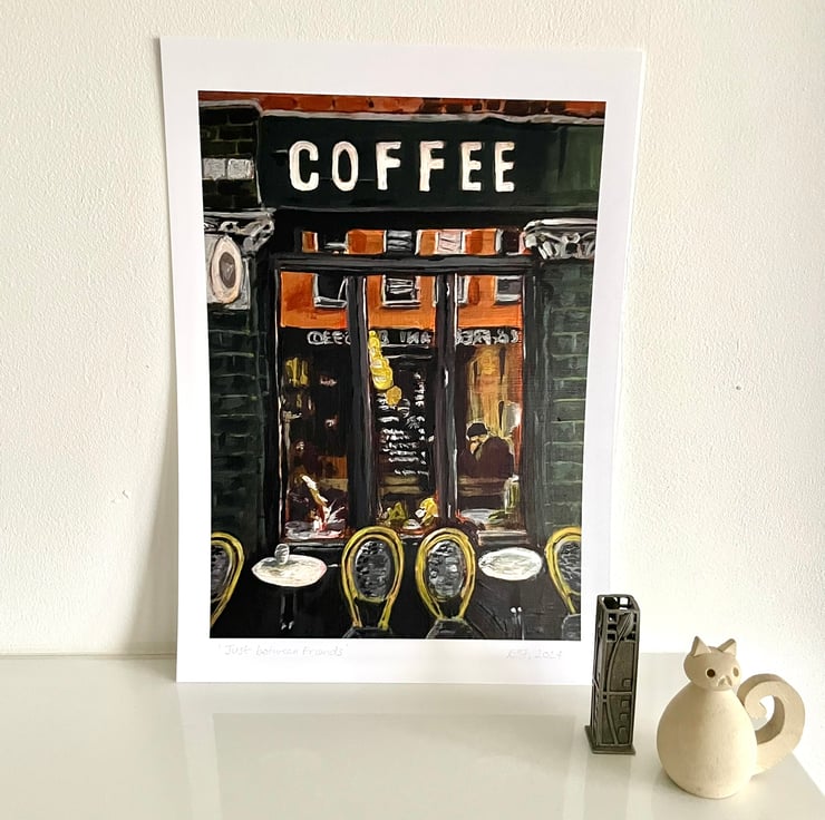 This high quality print is a reproduction of my original acrylic painting of Just between Friends coffee shop located in Manchester's (England) Northern Quarter. A cosy little spot in the city to have a catch up with a friend!