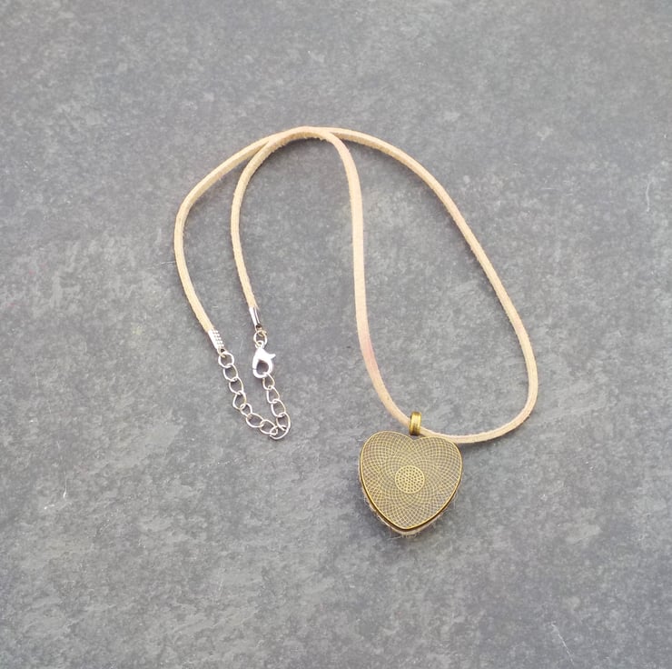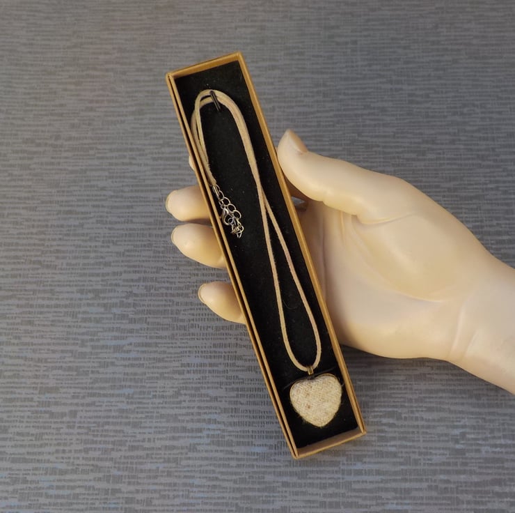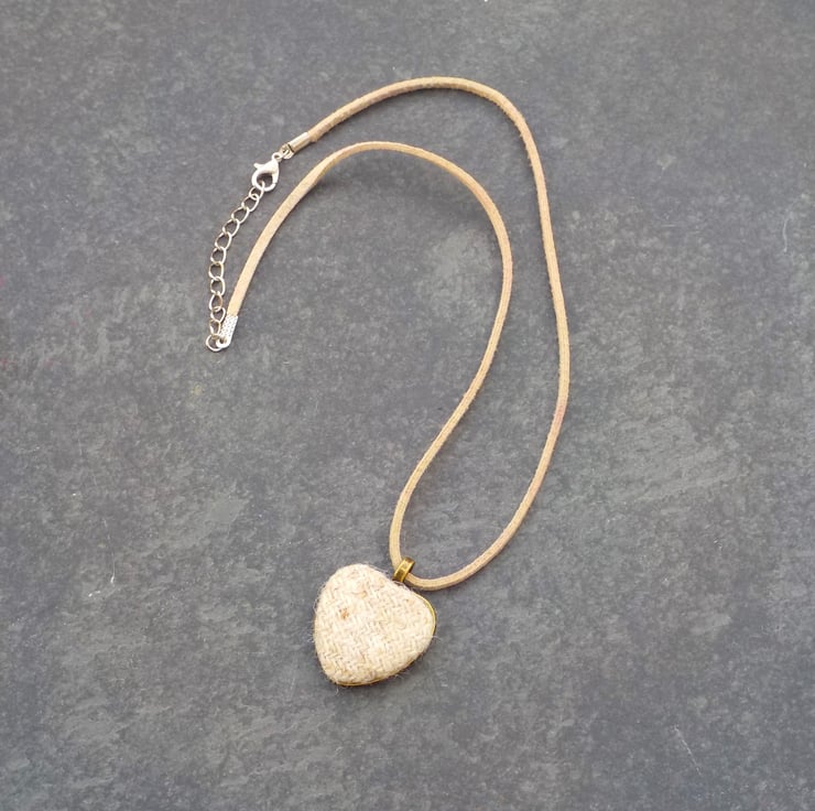 Here's sweet little heart pendant necklace; it is handmade from a mottled oatmeal cream design of Harris tweed fabric. I have shaped and mounted the Harris tweed onto a heart-shaped "antique bronze" coloured metal pendant, 2.5cm across. Then I have strung it onto a co-ordinating faux suede cord made with wool. The cord is 45cm (18") long, with a 5cm (2") extension chain.