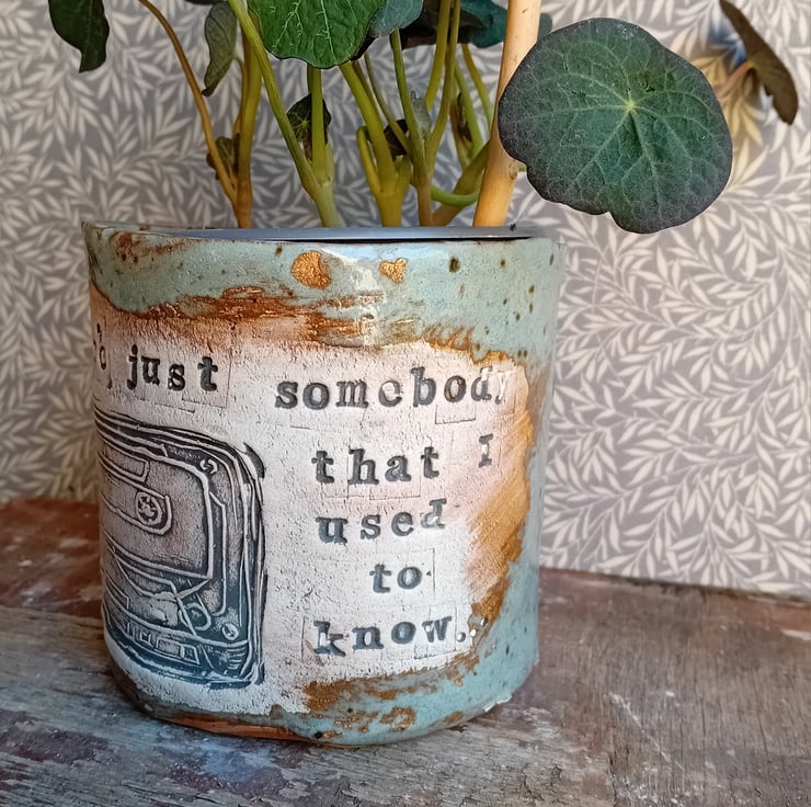 Song lyrics "somebody that I used to know" 9cm x 9-11cm brown speckle with teal/blue