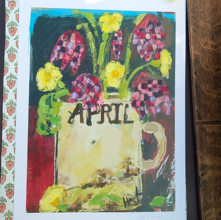 Whimsical and sweet, primroses in a child's shoe. A print taken from one of my original paintings. I've then colour match and painted on this print to give it texture and the feel of an original painting. A4 size . Celebrating spring . Free UK postage
