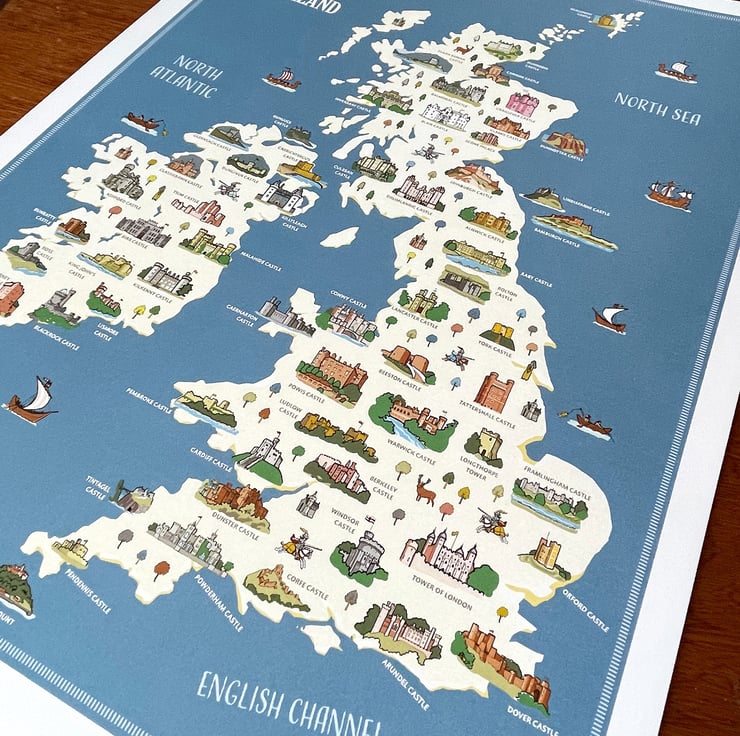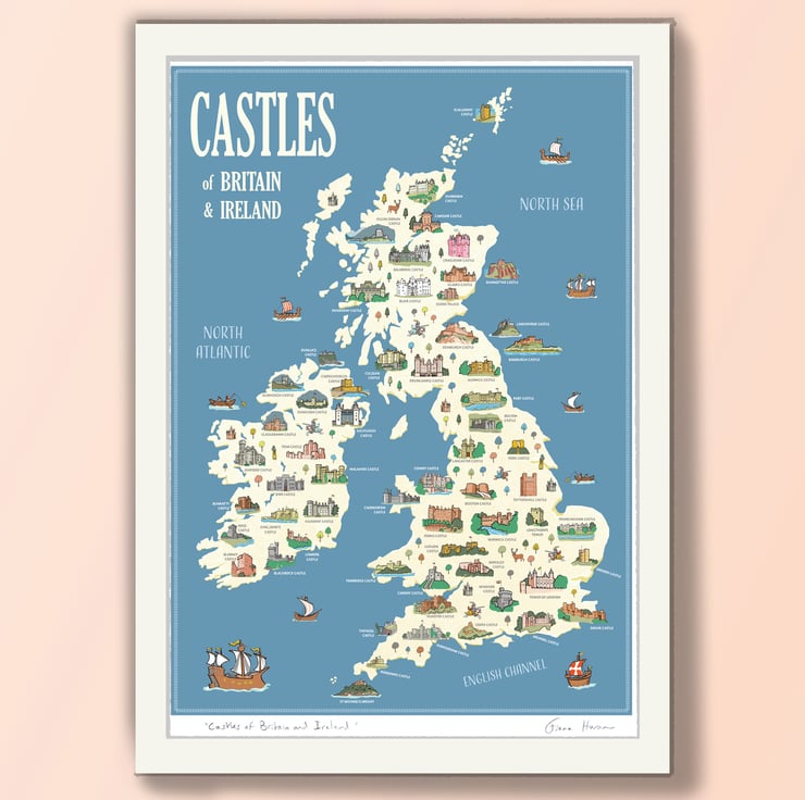 Beautiful map poster with illusrations of many of the most remarkable castles of Britain and Ireland including the Tower of London, Windsor Castle, Balmoral, Dover Castle, Warwick Castle, the Castle of Mey, the romantic ruins of Dunnottar, Corfe and Tintagel, Craigievar, Eilean Donan, Edinburgh Castle, Conwy Castle, Blarney Castle and Birr Castle. About 40 illustrations in all!