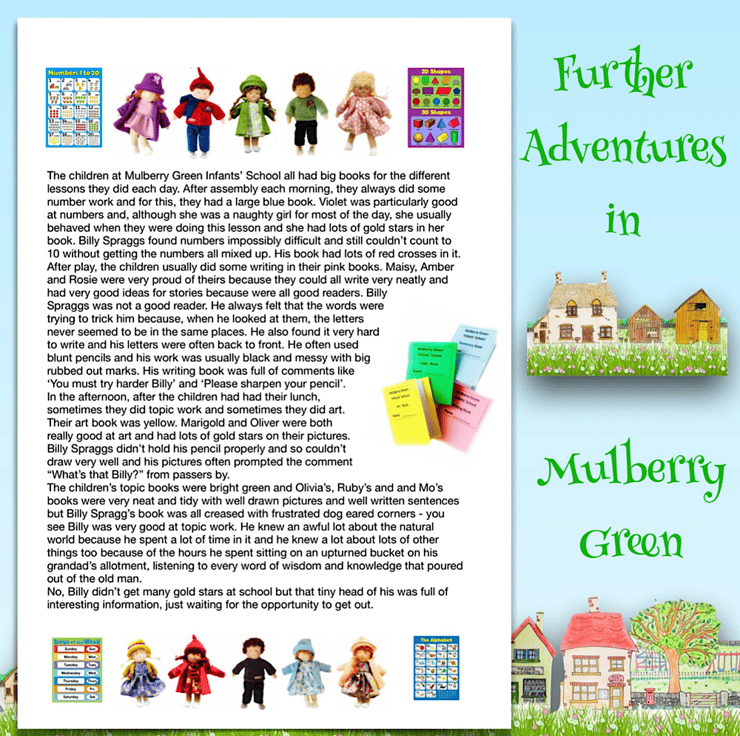 There are other children in Maisy’s class at Mulberry Green Infants’School - Violet, Billy, Amber, Rose, Ruby, Marigold, Tilly, Amelia and twins Oliver and Olivia. The children are all 28cm tall, Baby Daisy is 16cm and Molly the dog is just 8cm. Maisy and Mo love nothing more than having adventures with their friends.