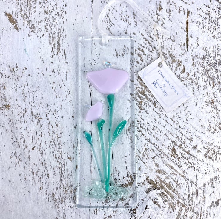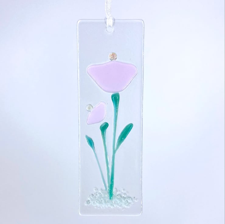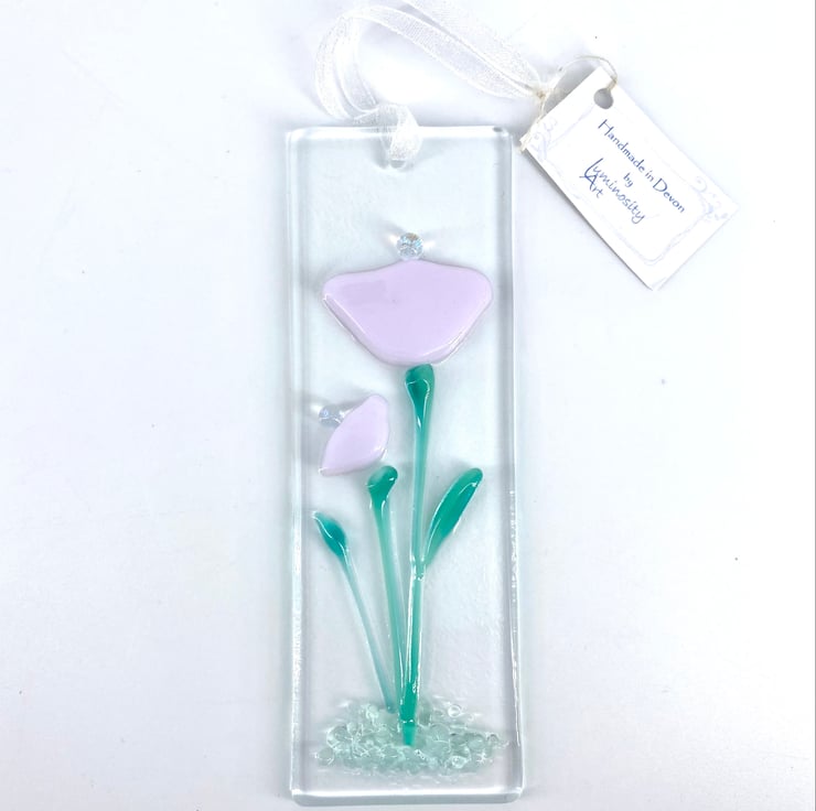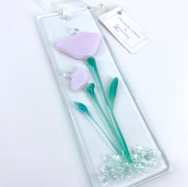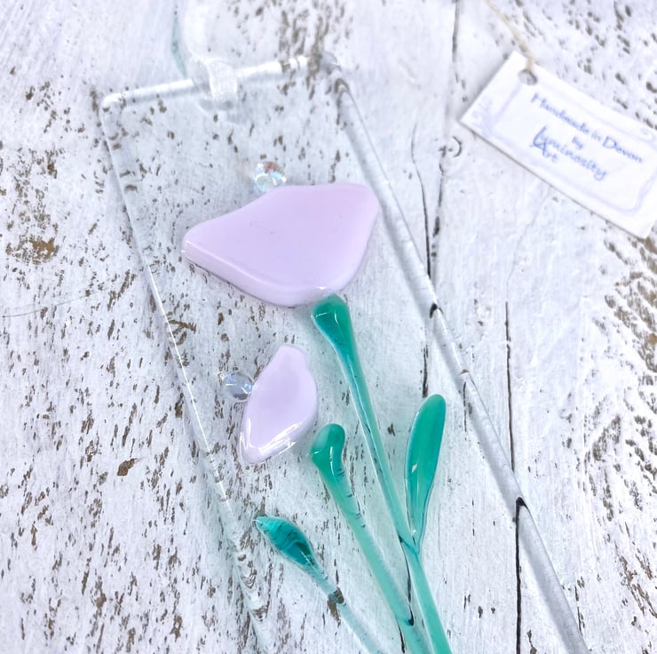 A pretty pink floral design with delicate lamp worked stems and leaves and sparkly dichroic detail which catches the light beautifully.