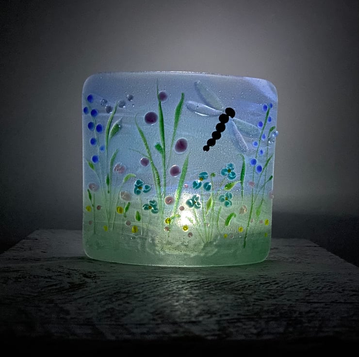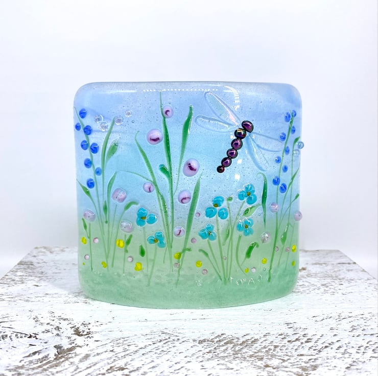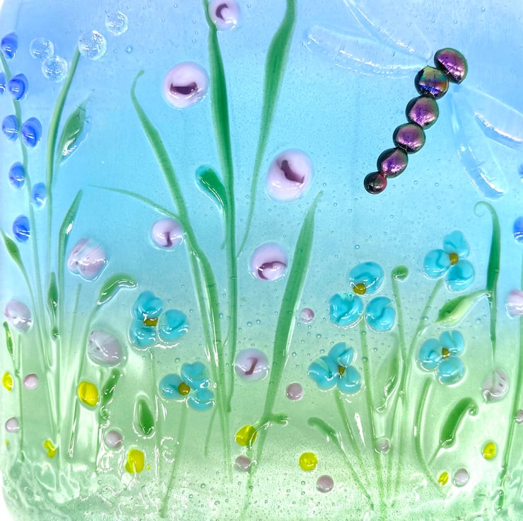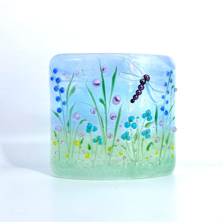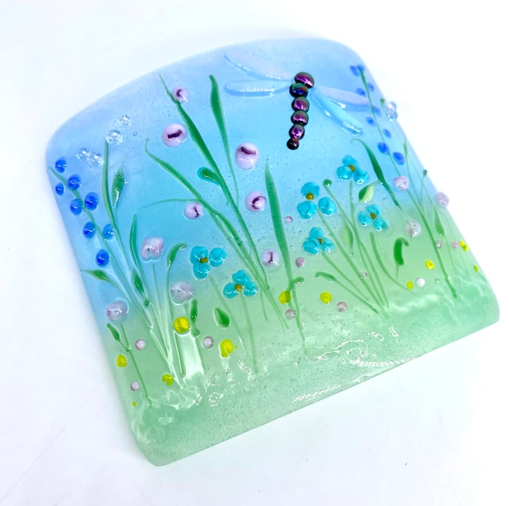 A pretty, free standing glass curve with a delicate flower meadow. A mix of pastel shades with a gorgeous dragonfly with iridescent wings.