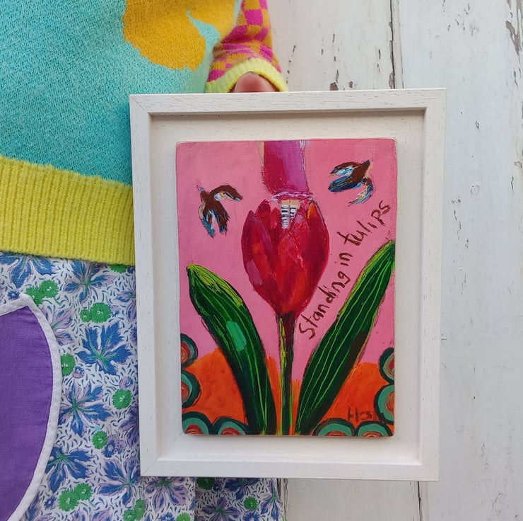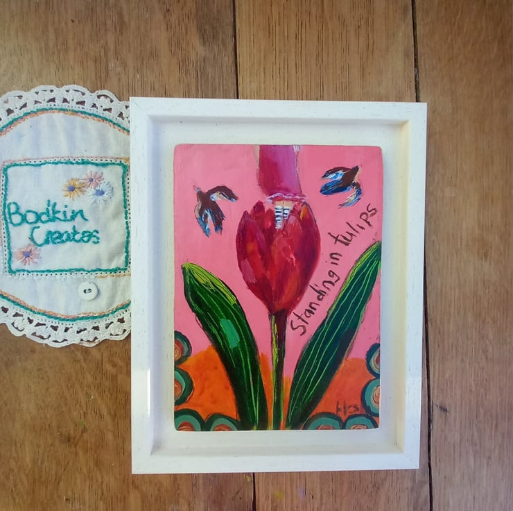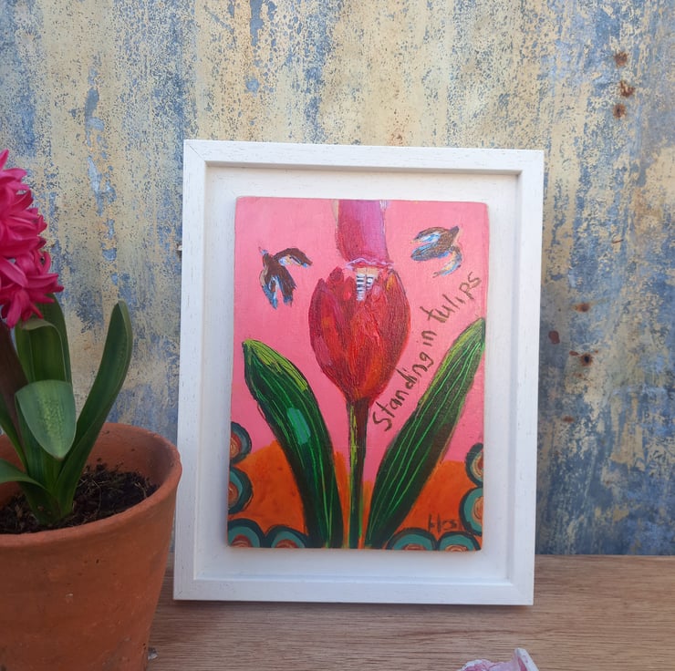 This is an original painting in a hand made wooden frame. Beautiful one off painting.24 cm tall 19 wide. Imagine the joy of bring so small you could stand in a tulip. This is the magic of folklore and fairy tales. I will wrap it very mindfully and hope it makes you smile . Signed and lightly varnished.