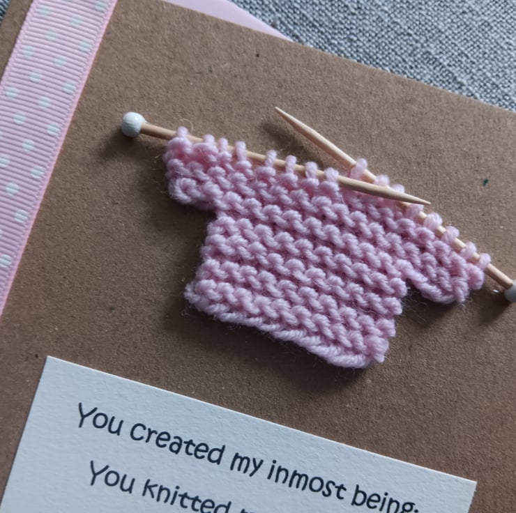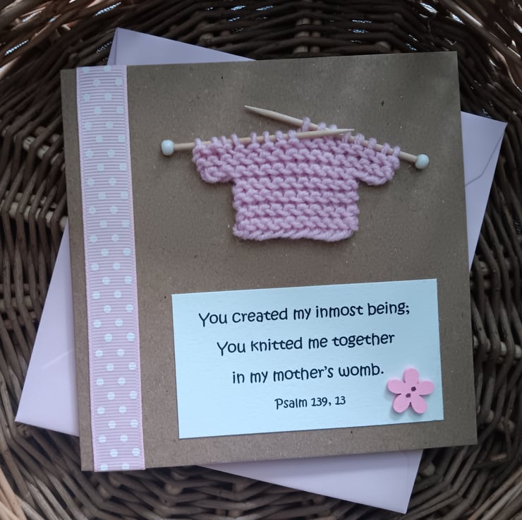 The knitted jumper is knitted by me with quality pink yarn and then transferred onto my handmade tiny knitting needles. The text from Psalm 139 is printed on inkjet Bockingford watercolour paper. The card is finished with a matching length of pink ribbon and a flower shaped button. This card design is available in blue or cream (see separate listings). You can also purchase small knitted jumpers gift tags in a variety of colours in my shop.