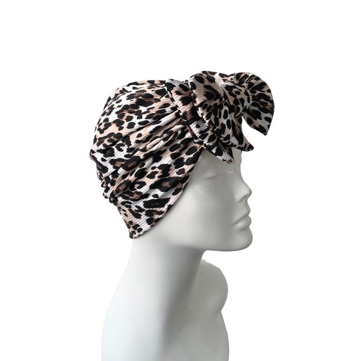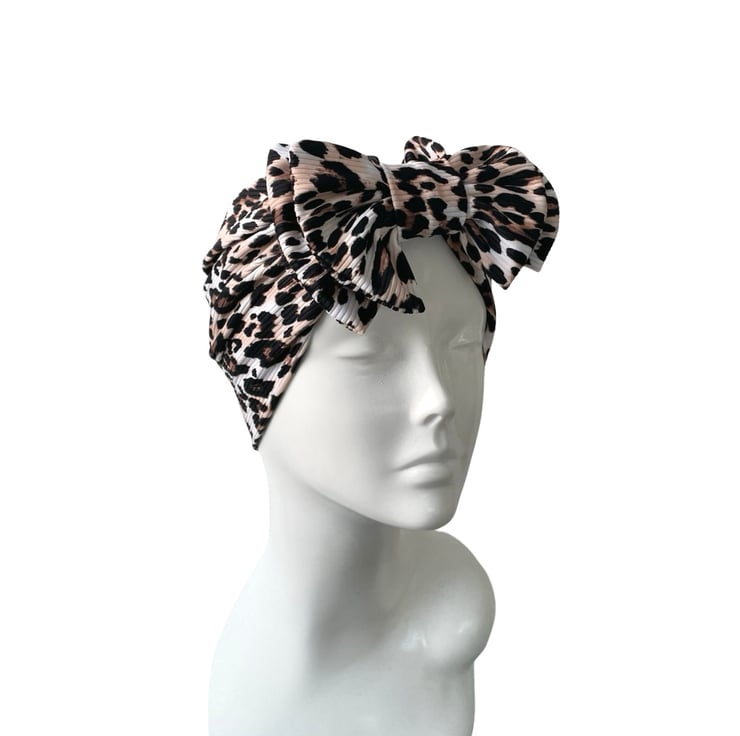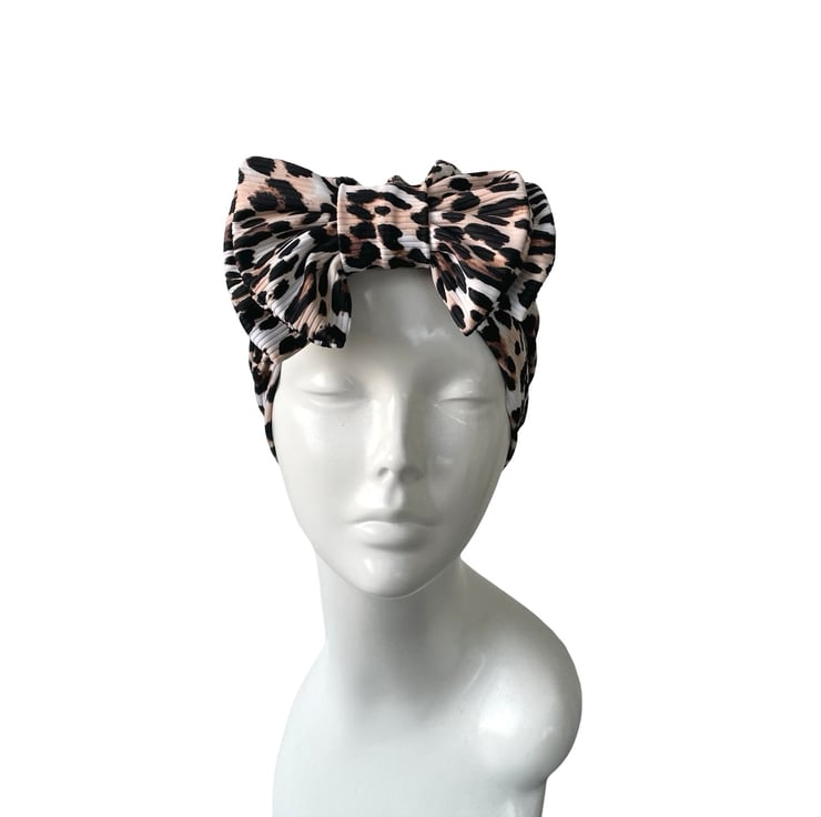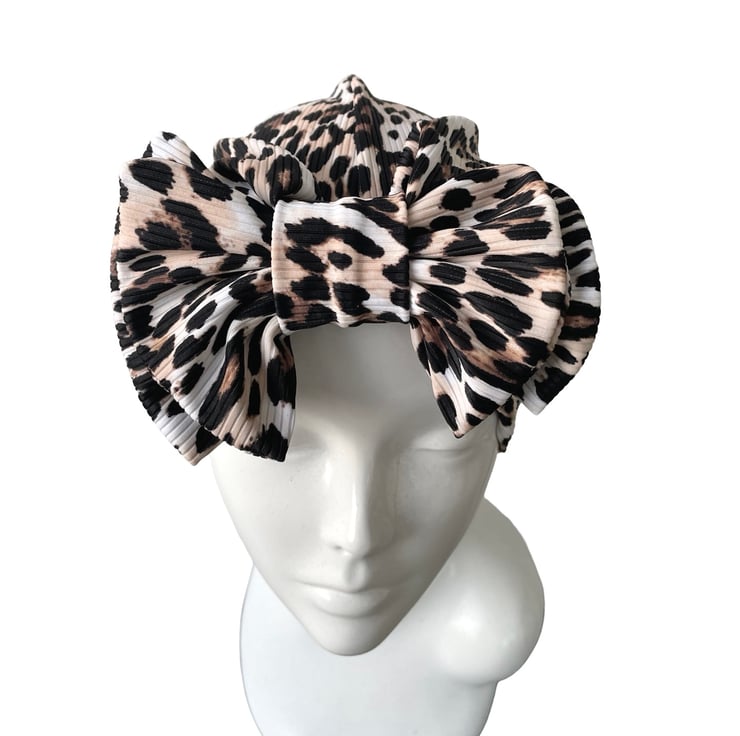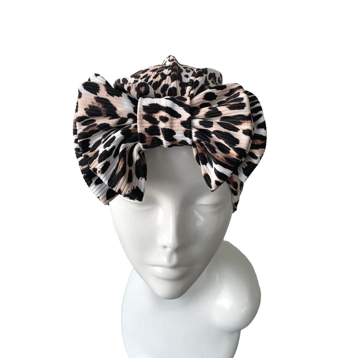 This front bow turban hat will fit a small to adult's head (21-23'').