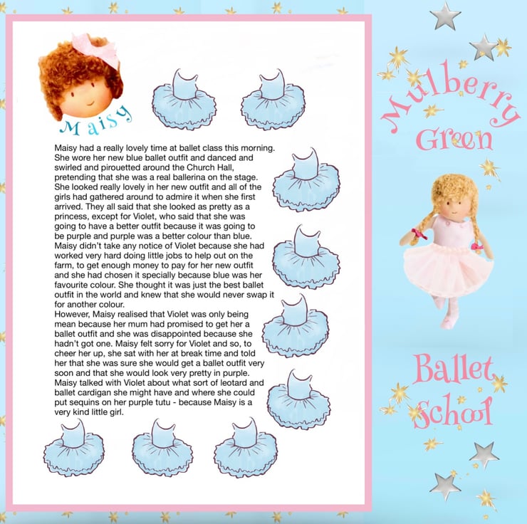 There are other children in Maisy’s class at Mulberry Green Infants’School - Violet, Billy, Amber, Rose, Ruby, Marigold, Tilly, Amelia and twins Oliver and Olivia. The children are all 28cm tall, Baby Daisy is 16cm and Molly the dog is just 8cm. Maisy and Mo love nothing more than having adventures with their friends.