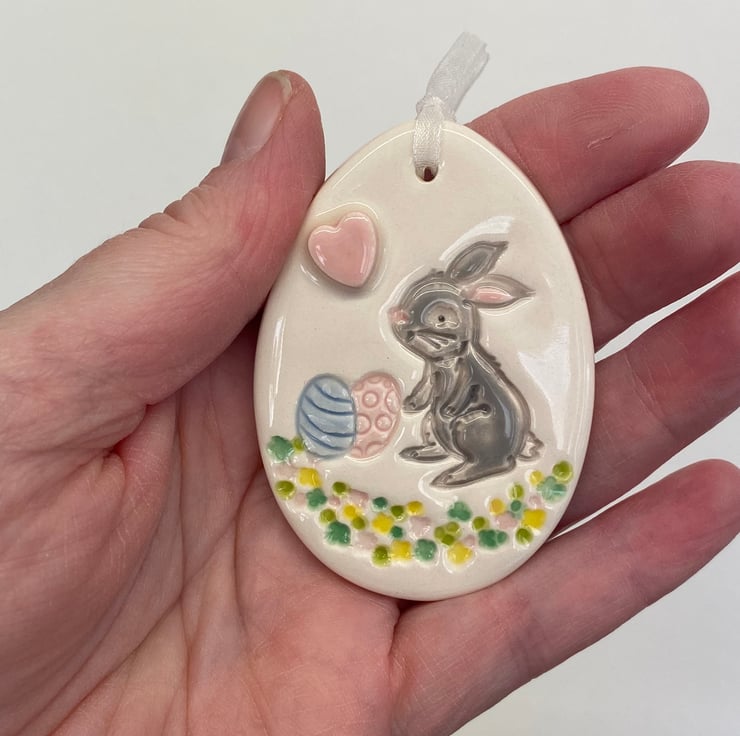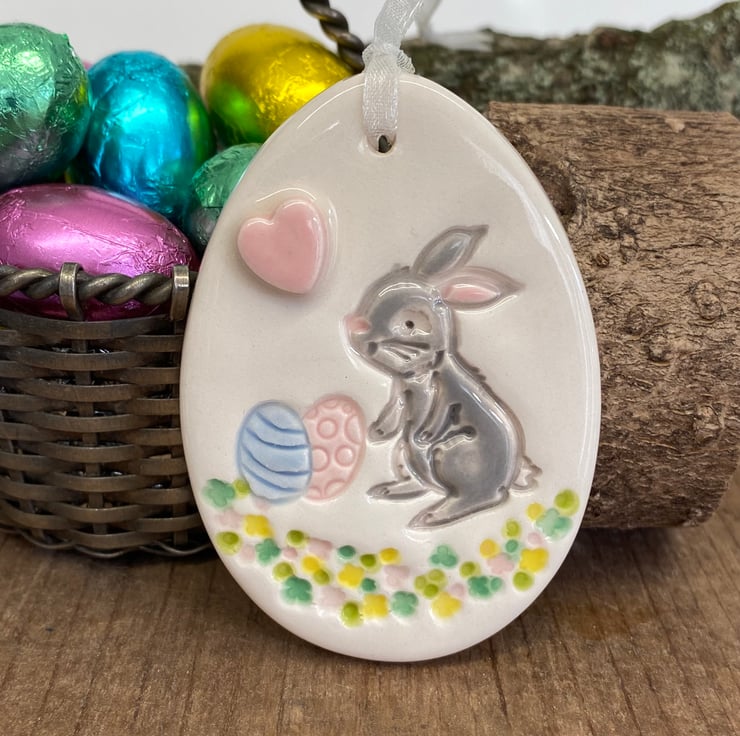 This little ceramic easter egg is made from white earthenware clay and topped with a bunny, heart and flowers. This has been fired in an electric pottery kiln, so it is nice and strong. It measures 6.5cm x 4.5cm and hangs from a matching cream organza ribbon. It is glazed on the front and left plain on the back.