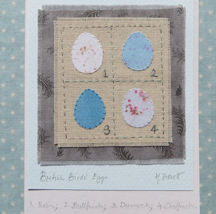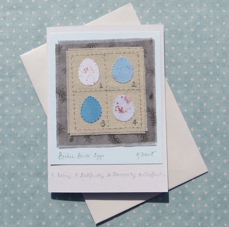 This is a small handmade greeting card featuring miniature hand-stitched applique. The design features lifesize birds' eggs cut from hand-dyed fabrics with a number reference to explain which birds the eggs belong to! (The birds are written beneath).