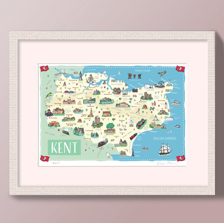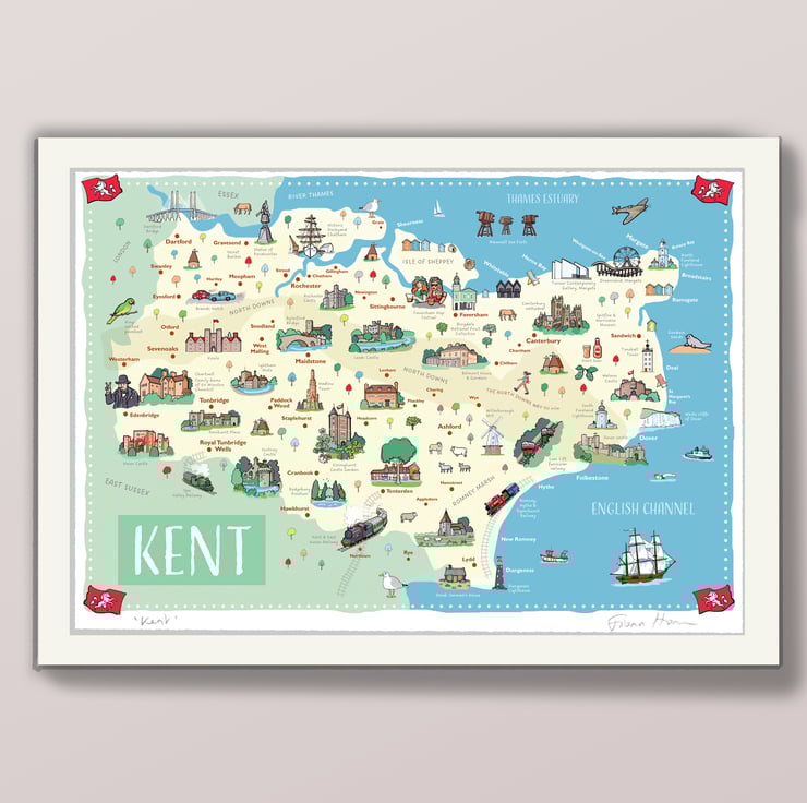 Lovingly detailed illustrated ornamental wall map of the county of Kent - the garden of England.