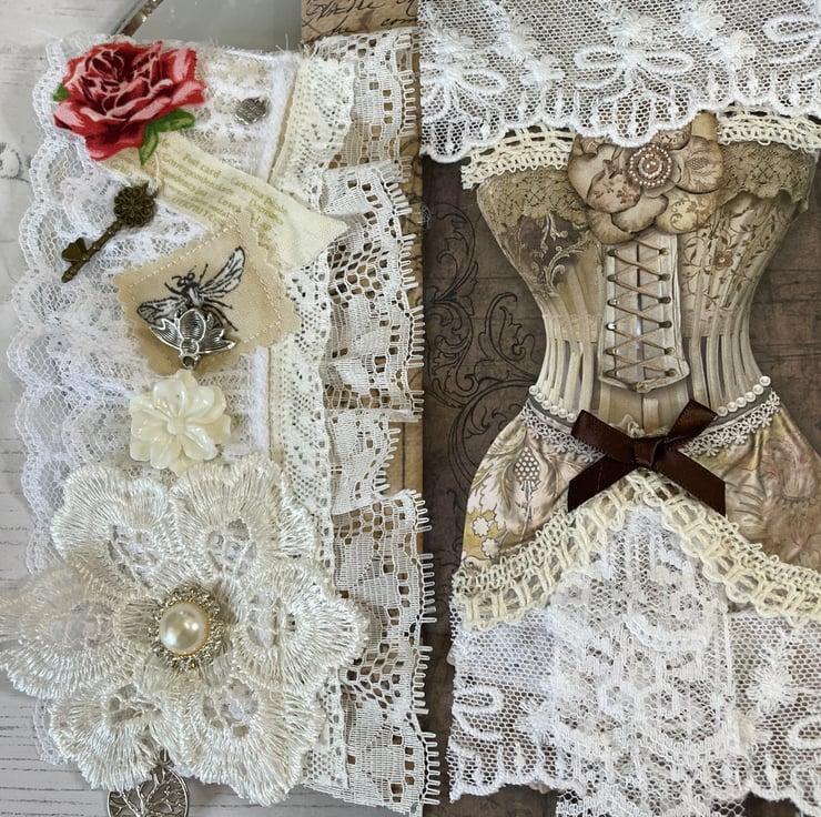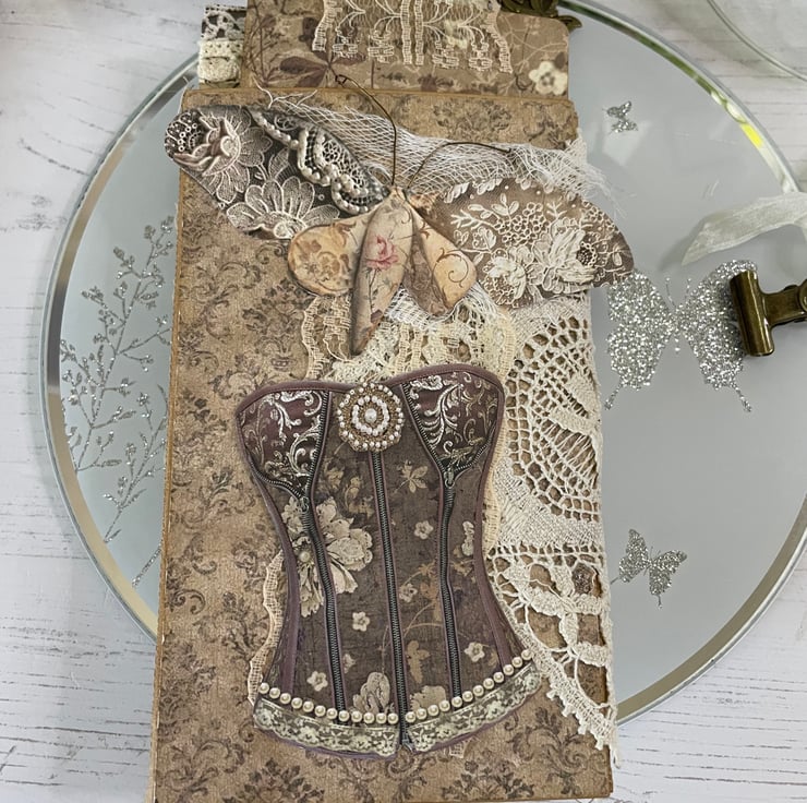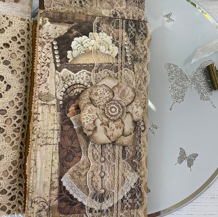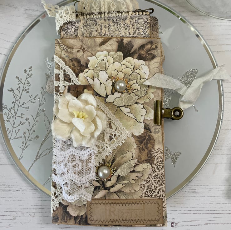 Quarter circle pockets made from air fryer liners. 2 liners stitched with papers on the inside 24 pages. Edged with roses, lace and tag topper and a doily wrapped round the middle. Held together with a mini bulldog clip, ribbon, beads and charms. Measures 6" x 6".